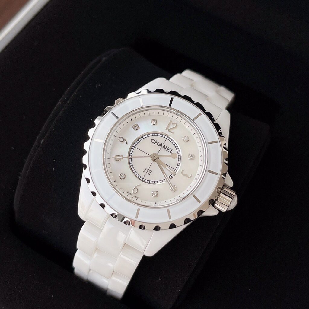 2000年当時、金型成形しかできなかったセラミックで平面的な四角ではなく、立体的で複雑な丸型ケースをJ 12ははじめて実現。同じくセラミック製のブレスレットの各リンクも、多方向に面取りした形状になっている。