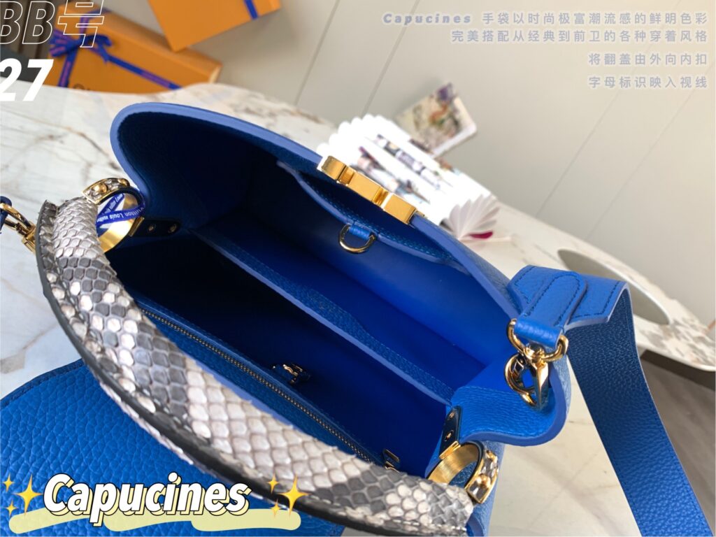 カプシーヌは、1854年にルイ・ヴィトンが始めて出店したパリのカプシーヌ通りのネーミングが由来のフラップ付きハンドバッグ。台形型のフォルムとシンプルでクラシカルなルックスが特徴のカプシーヌは、丸みを帯びたトップハンドルとハンドルをつなぐ美しいリングがとてもエレガント!そしてなんといっても、バッグの開口部分にかたどられたLVのロゴのシグネチャーが、カプシーヌの大きな魅力となっています。