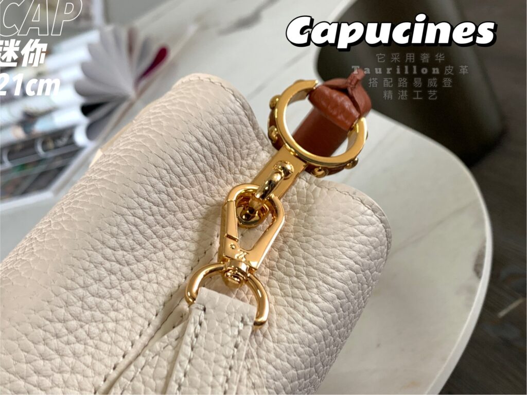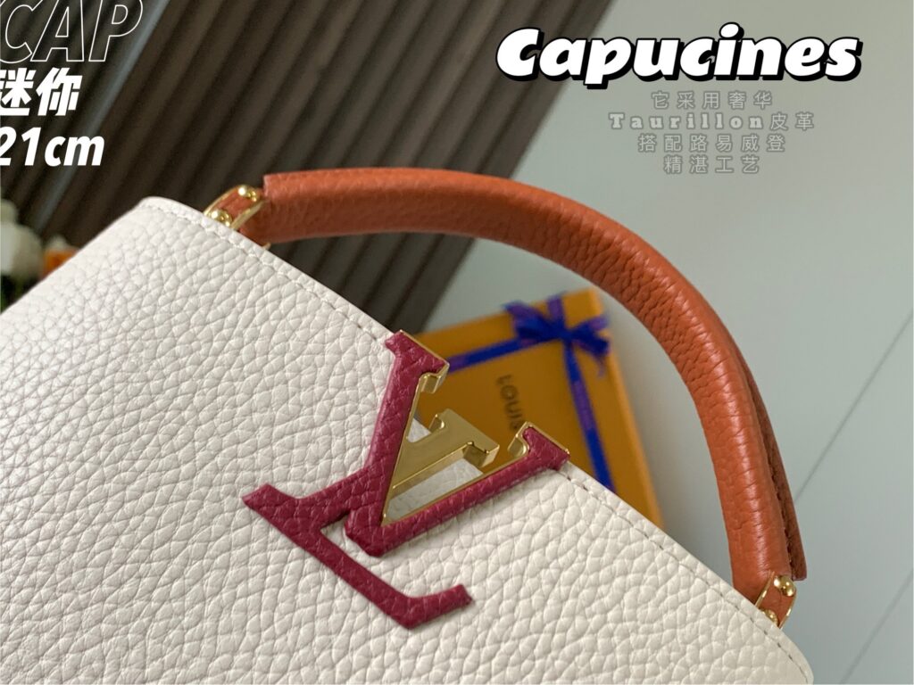 カプシーヌは、1854年にルイ・ヴィトンが始めて出店したパリのカプシーヌ通りのネーミングが由来のフラップ付きハンドバッグ。台形型のフォルムとシンプルでクラシカルなルックスが特徴のカプシーヌは、丸みを帯びたトップハンドルとハンドルをつなぐ美しいリングがとてもエレガント!そしてなんといっても、バッグの開口部分にかたどられたLVのロゴのシグネチャーが、カプシーヌの大きな魅力となっています。
