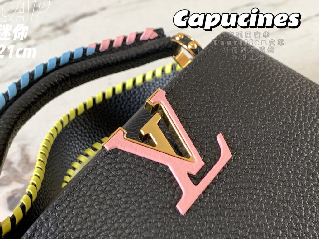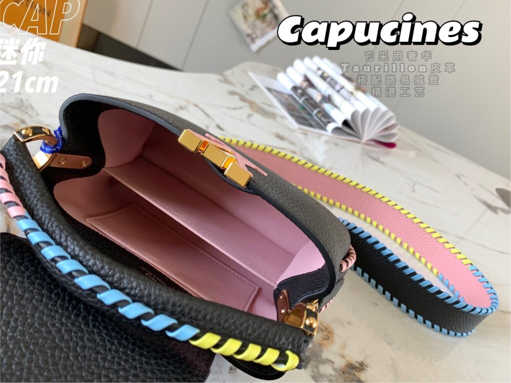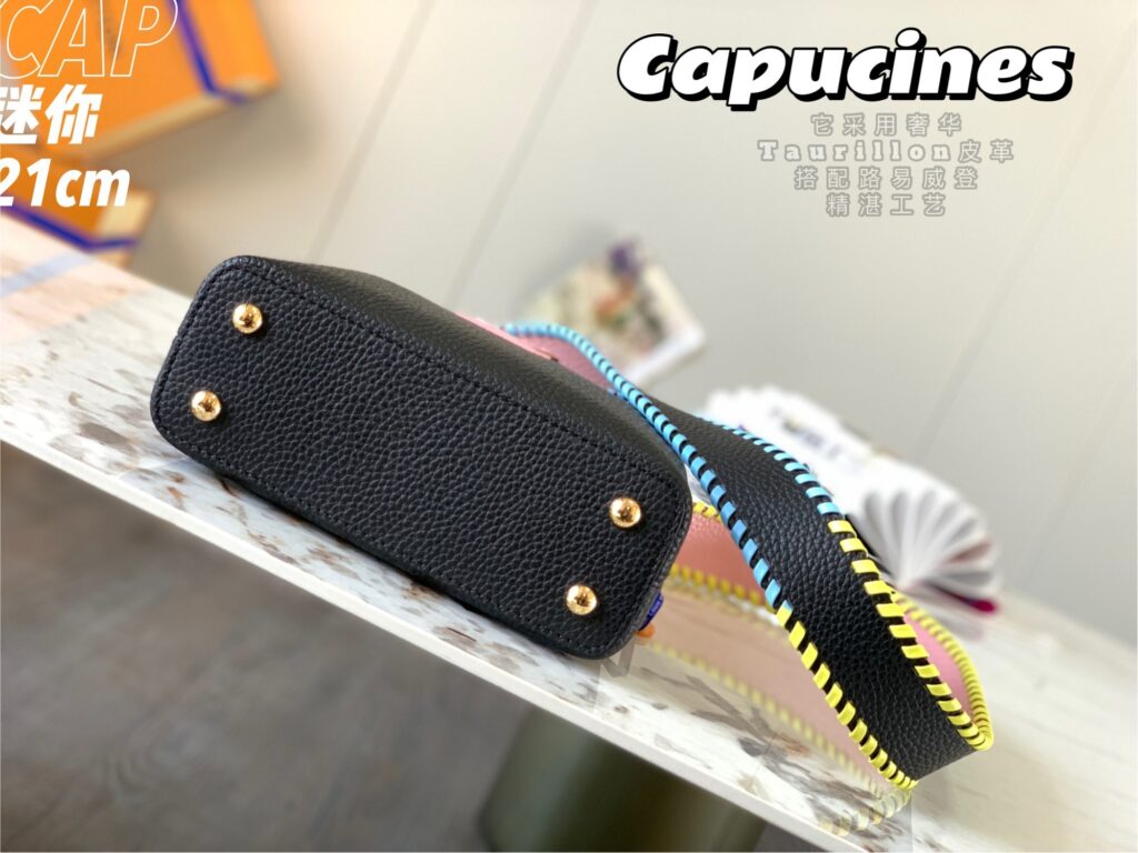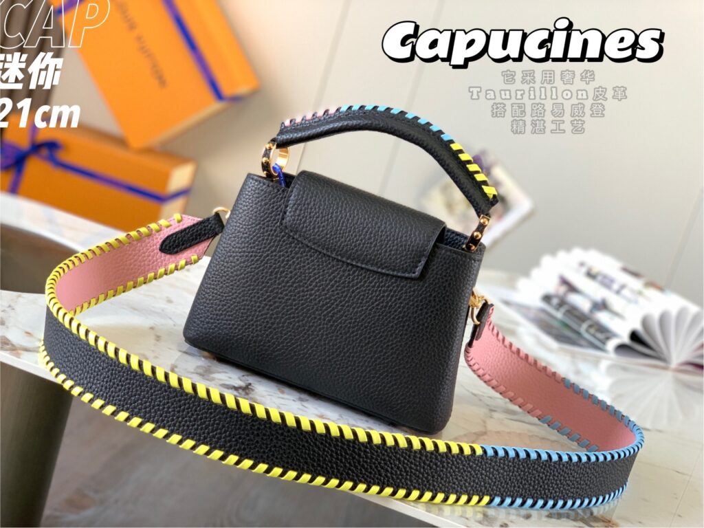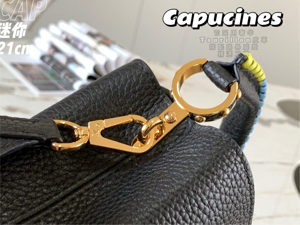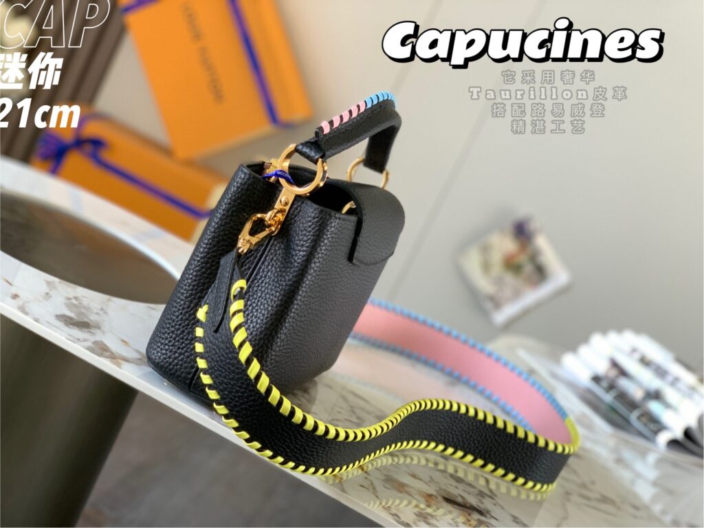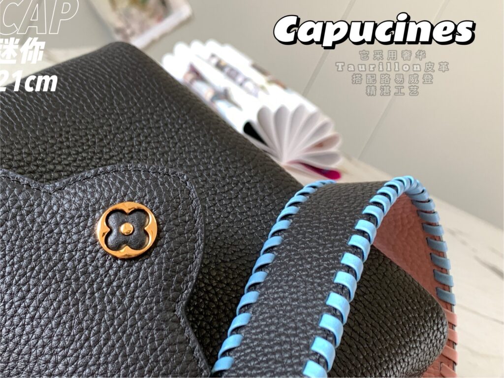 カプシーヌは、1854年にルイ・ヴィトンが始めて出店したパリのカプシーヌ通りのネーミングが由来のフラップ付きハンドバッグ。台形型のフォルムとシンプルでクラシカルなルックスが特徴のカプシーヌは、丸みを帯びたトップハンドルとハンドルをつなぐ美しいリングがとてもエレガント!そしてなんといっても、バッグの開口部分にかたどられたLVのロゴのシグネチャーが、カプシーヌの大きな魅力となっています。