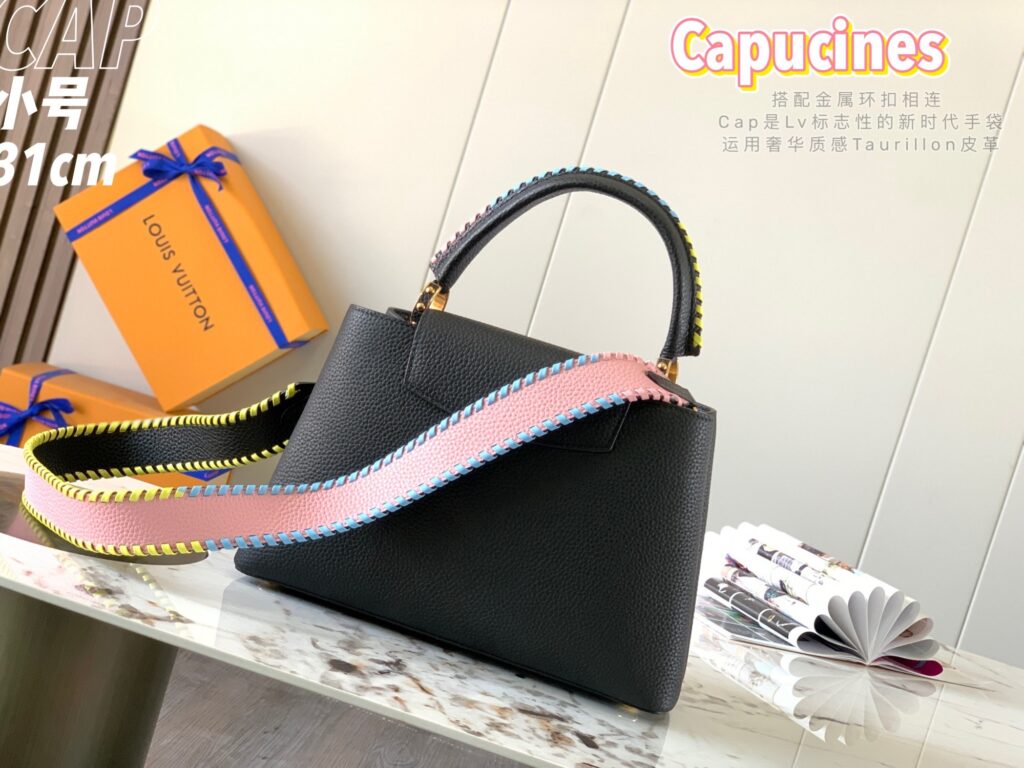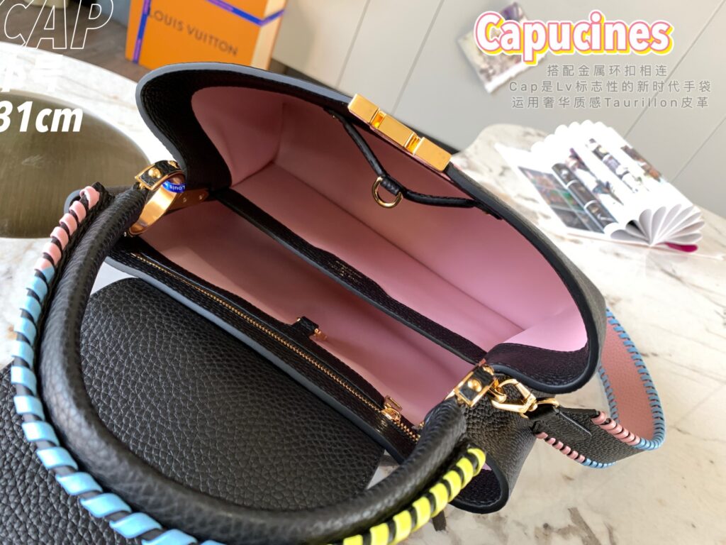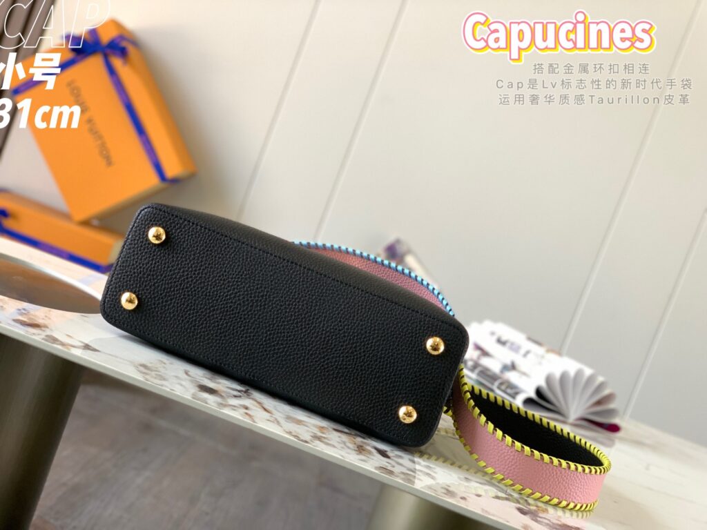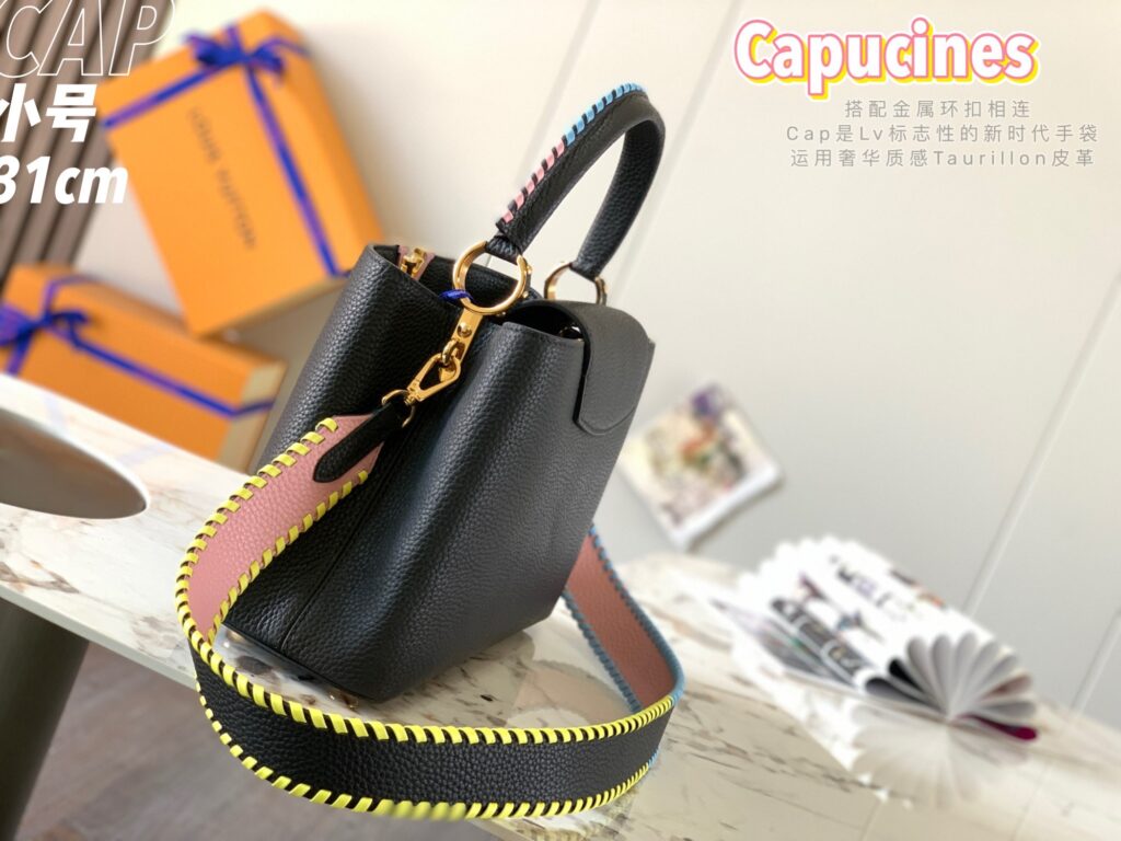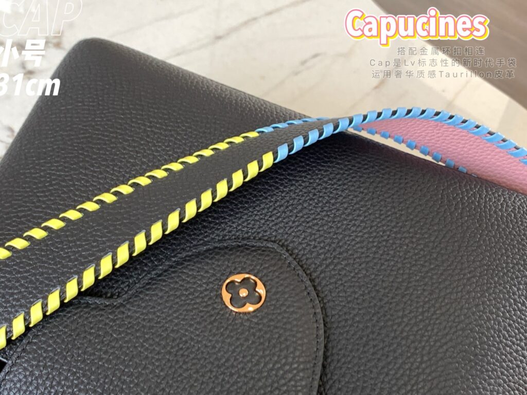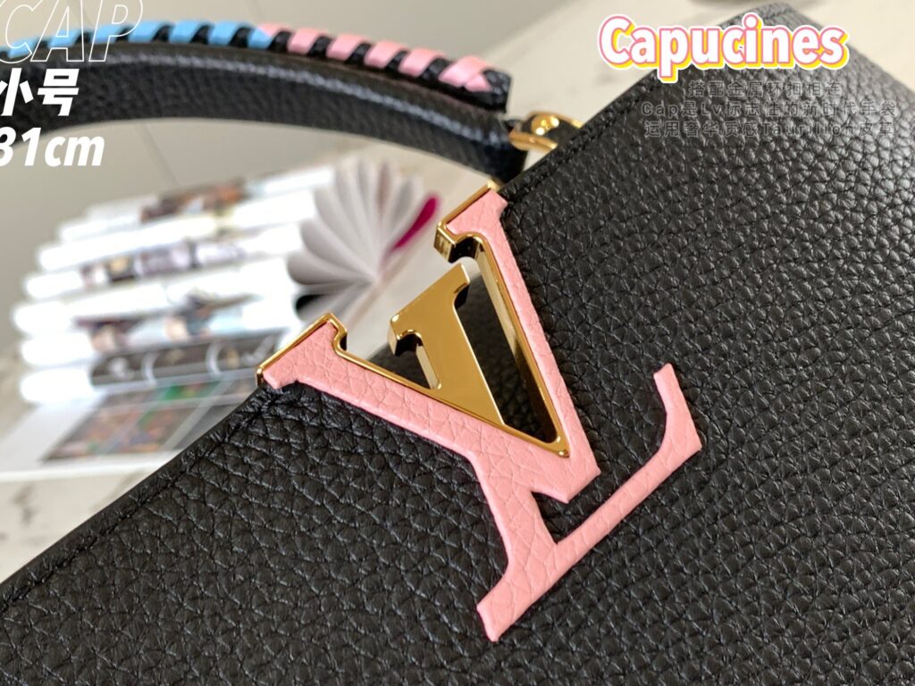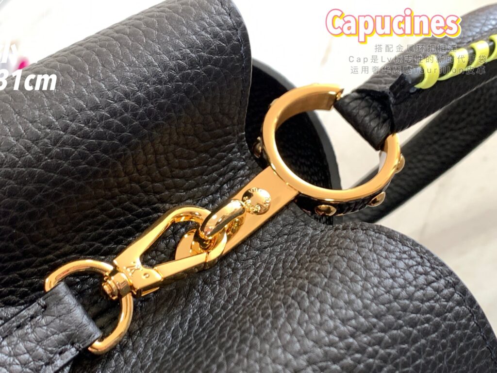 カプシーヌは、1854年にルイ・ヴィトンが始めて出店したパリのカプシーヌ通りのネーミングが由来のフラップ付きハンドバッグ。台形型のフォルムとシンプルでクラシカルなルックスが特徴のカプシーヌは、丸みを帯びたトップハンドルとハンドルをつなぐ美しいリングがとてもエレガント!そしてなんといっても、バッグの開口部分にかたどられたLVのロゴのシグネチャーが、カプシーヌの大きな魅力となっています。