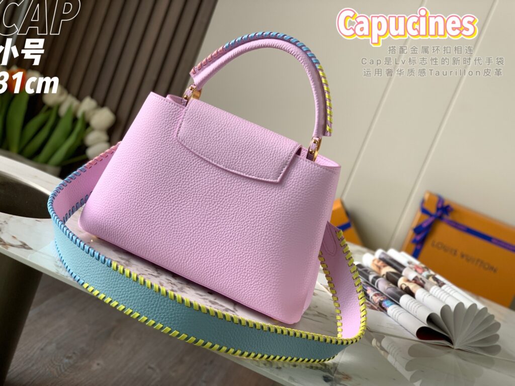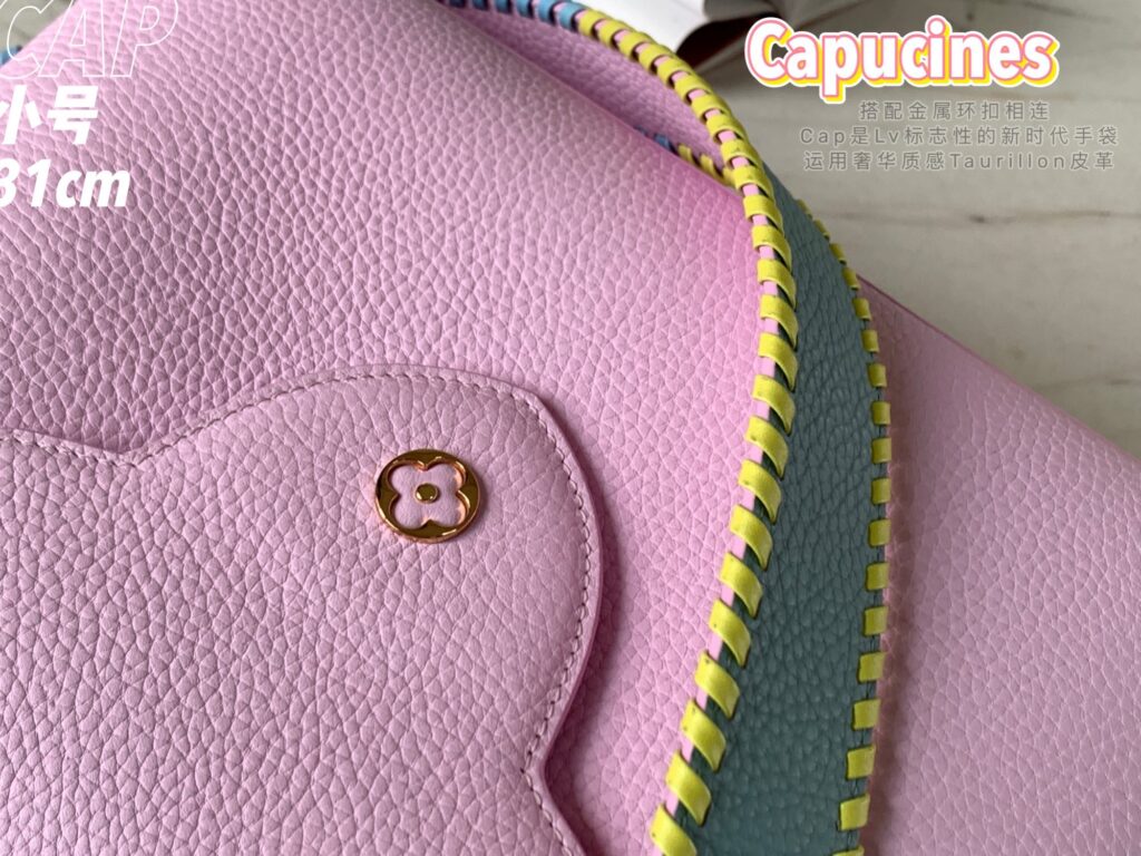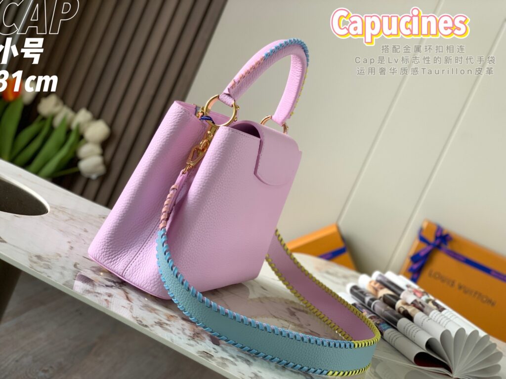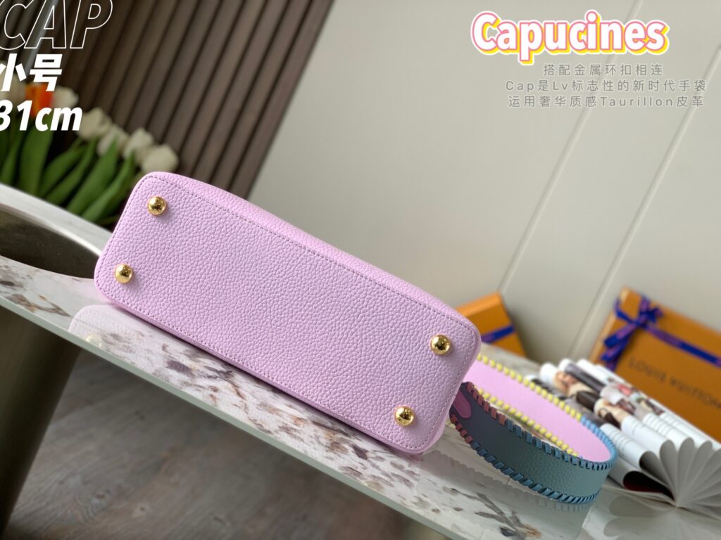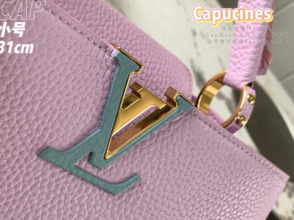 カプシーヌは、1854年にルイ・ヴィトンが始めて出店したパリのカプシーヌ通りのネーミングが由来のフラップ付きハンドバッグ。台形型のフォルムとシンプルでクラシカルなルックスが特徴のカプシーヌは、丸みを帯びたトップハンドルとハンドルをつなぐ美しいリングがとてもエレガント!そしてなんといっても、バッグの開口部分にかたどられたLVのロゴのシグネチャーが、カプシーヌの大きな魅力となっています。