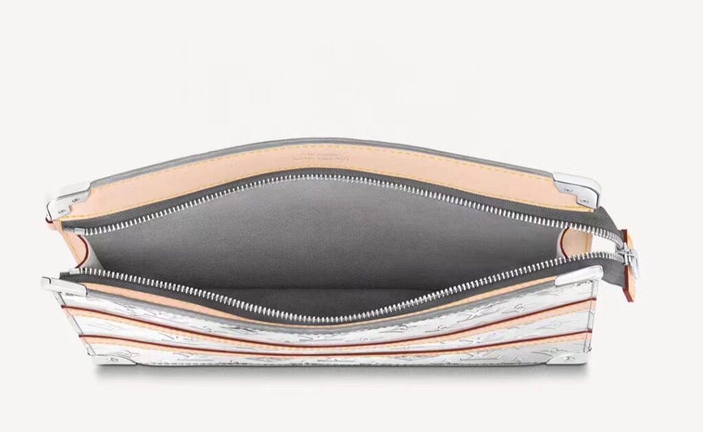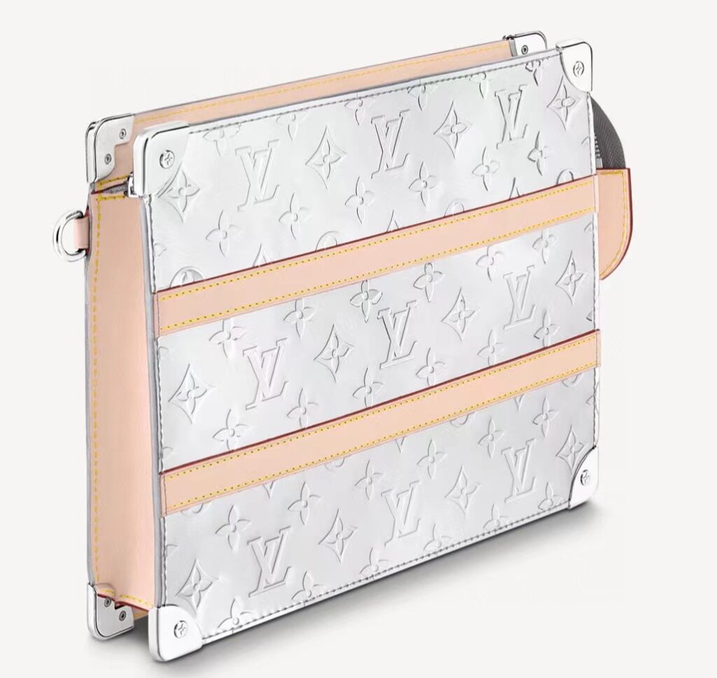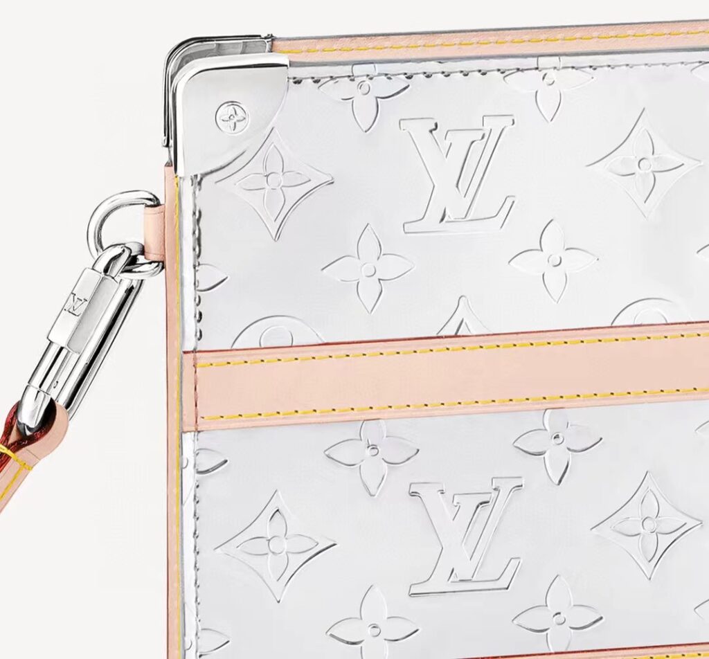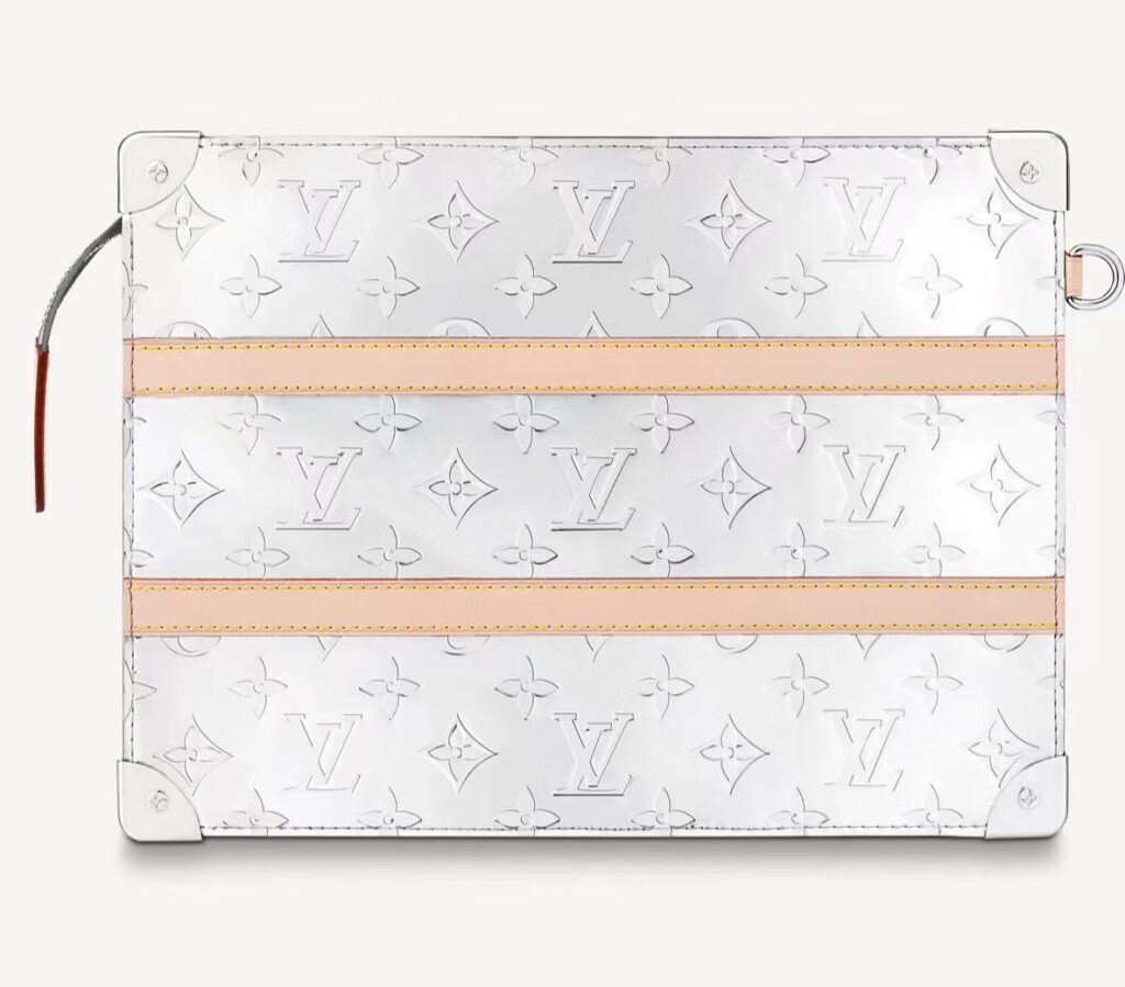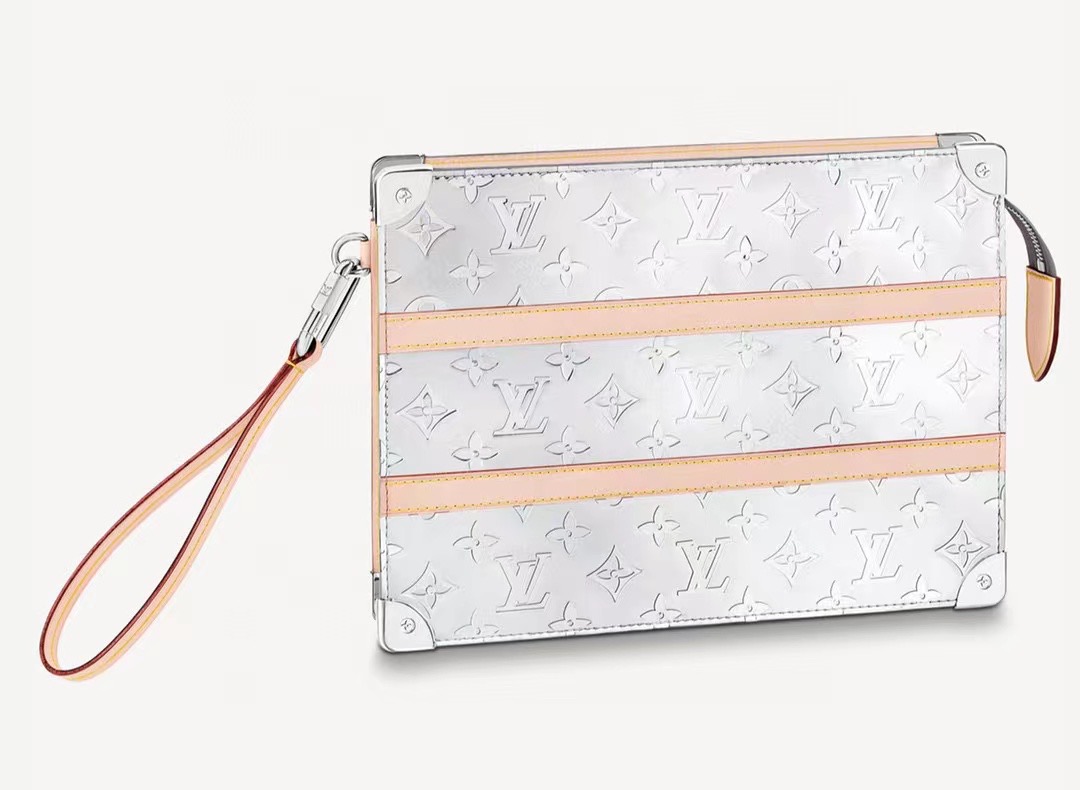 モノグラム・ミラー キャンバスにヌメ革のディテールあしらった「トランク・ポシェット」。補強を施したコーナー部分とリベットが、ルイ・ヴィトンのアイコニックなトランクを彷彿させます。手持ちできるリストストラップを取外せば、ポーチとして他のバッグに入れて使用することができます。スマートフォン、カードやコインを収納できる絶妙なサイズに仕上げました。