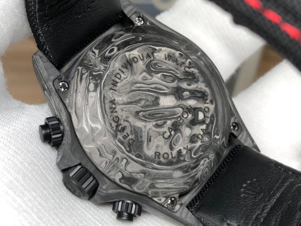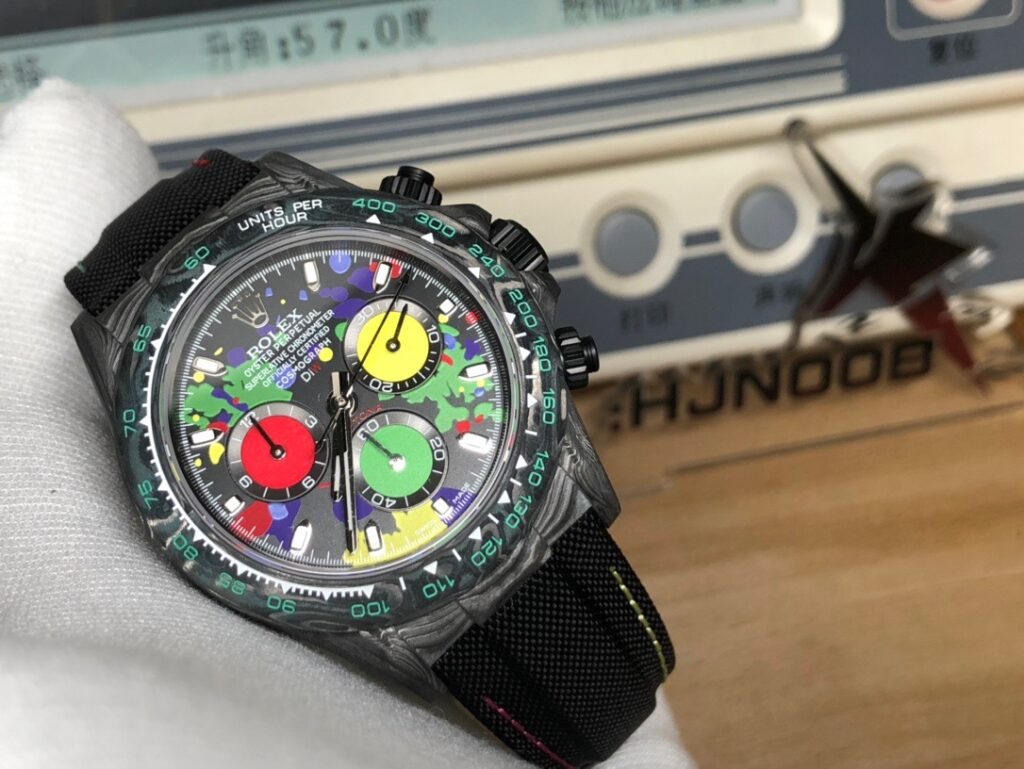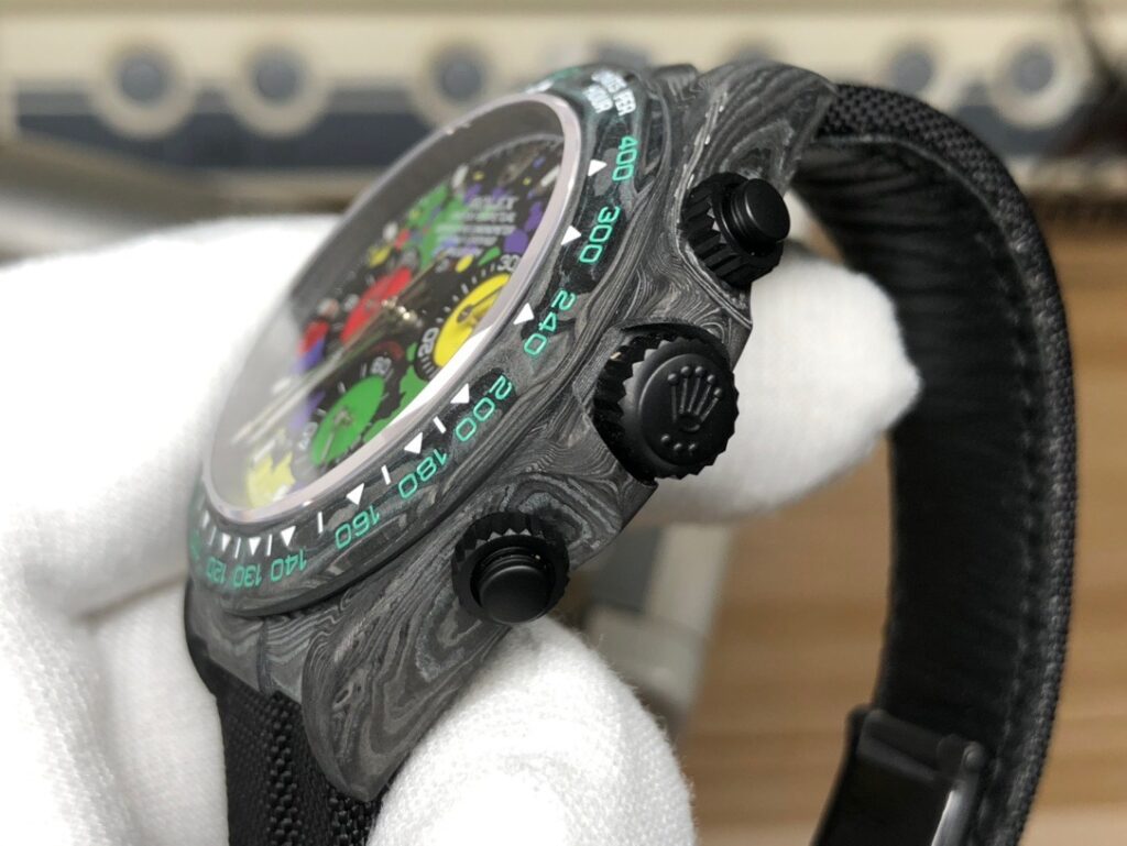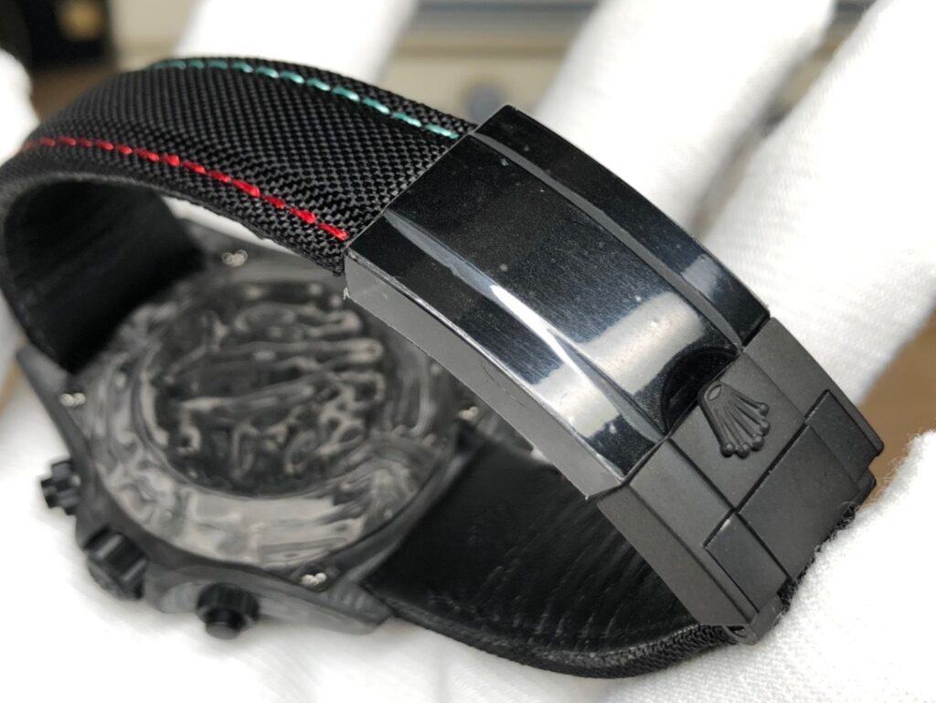 DiW primary goal is to enhance the sportiness of the Rolex Daytona and also focus on new and unique style. We finally determined to hand craft it using the high-end innovation of NTPT carbon fiber for the case, dial and bezel. The result is every DiW Daytona we made has its own unique carbon texture so they do not look the same! Using this material also make our carbon Daytona lightest in the world in less than 50g.