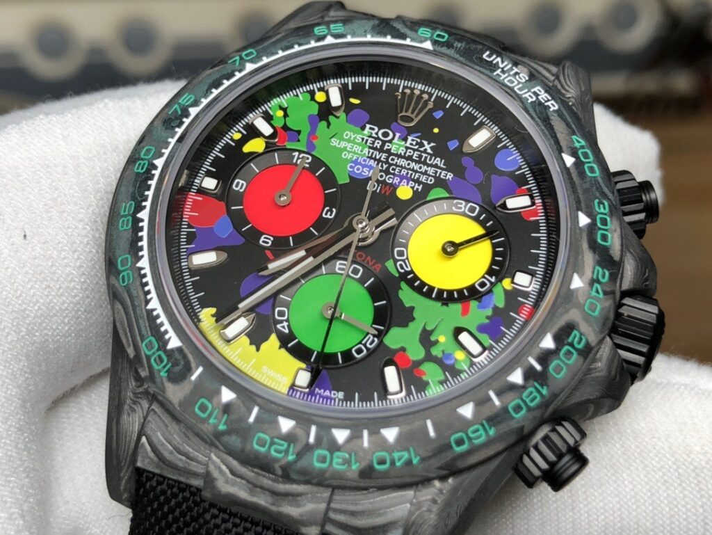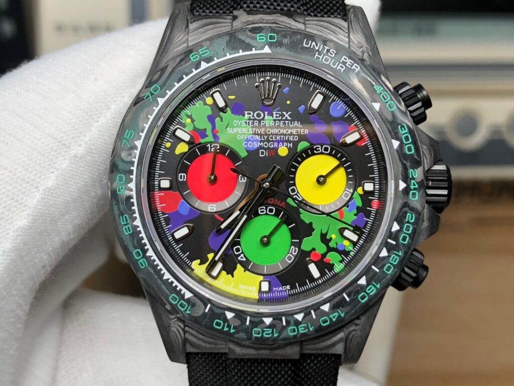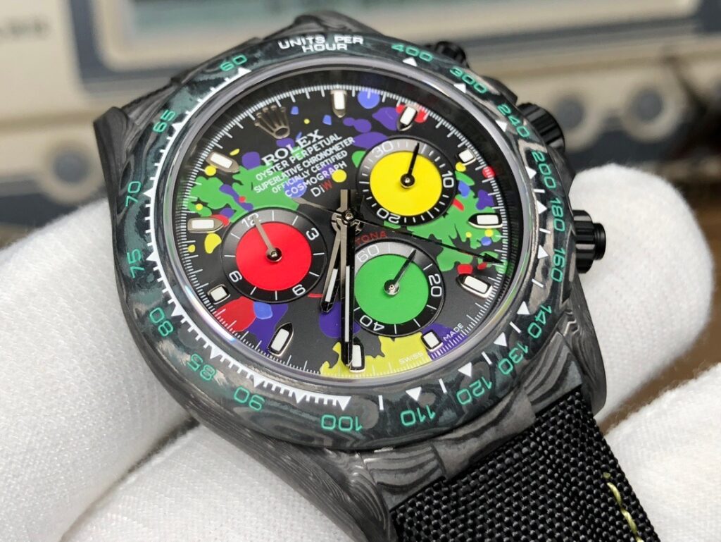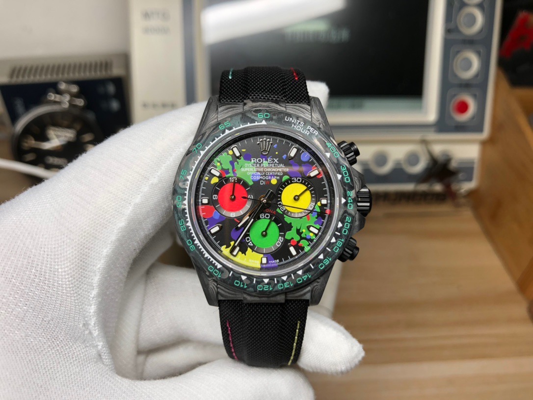 DiW primary goal is to enhance the sportiness of the Rolex Daytona and also focus on new and unique style. We finally determined to hand craft it using the high-end innovation of NTPT carbon fiber for the case, dial and bezel. The result is every DiW Daytona we made has its own unique carbon texture so they do not look the same! Using this material also make our carbon Daytona lightest in the world in less than 50g.