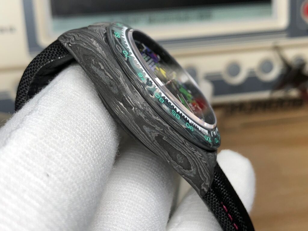 DiWの主な目標は、ロレックスデイトナのスポーティさを高め、新しいユニークなスタイルに焦点を当てることです。 最終的に、ケース、ダイヤル、ベゼルにNTPTカーボンファイバーのハイエンドイノベーションを使用して手作りすることを決定しました。 その結果、私たちが作成したすべてのDiW Daytonaは、独自のカーボンテクスチャを備えているため、同じようには見えません。 この素材を使用することで、カーボンデイトナは50g未満で世界最軽量になります。