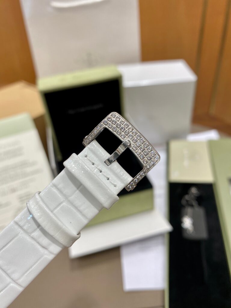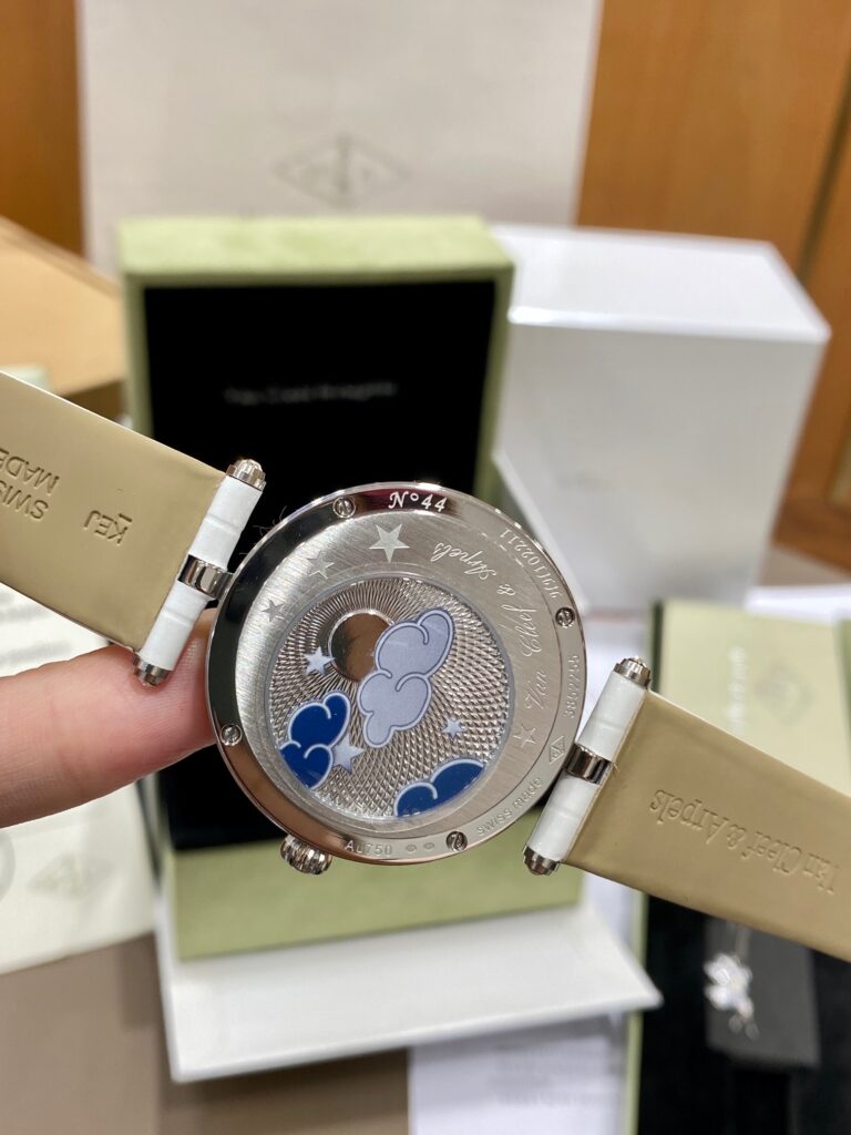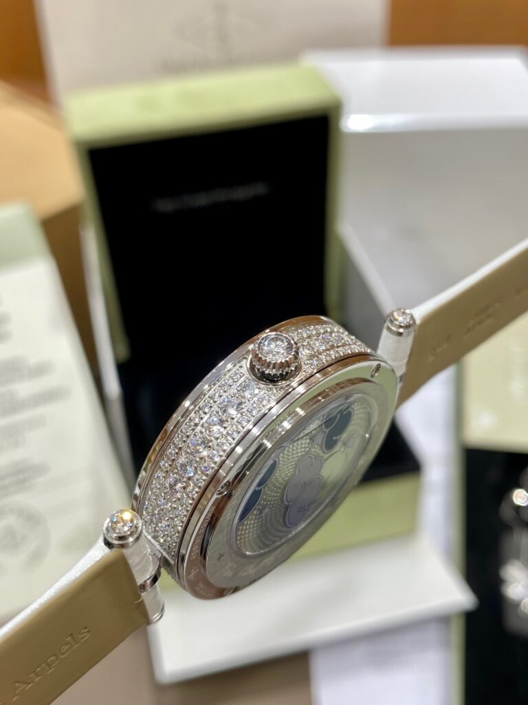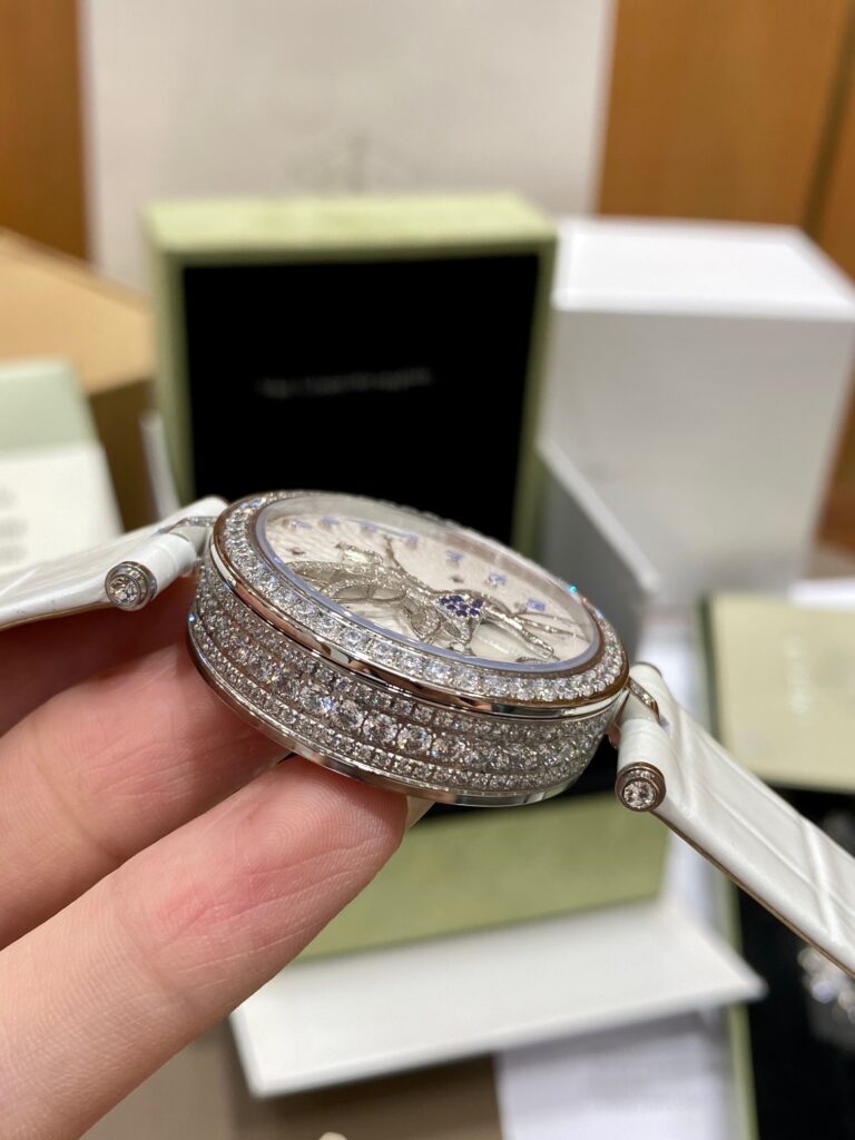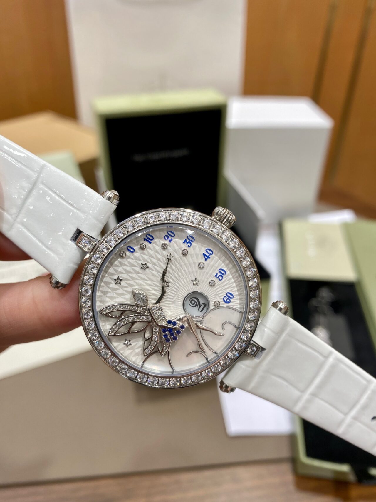 守護の女神として女性らしさを象徴する妖精が、サファイアとダイヤモンドのドレスを身に纏い、詩情とともに時を紡いでいます。その羽はターコイズカラーのプリカジュール エナメルで彩られ、ギヨシェ彫刻を施したマザーオブパールにダイヤモンドを配して創られた星空のニュアンスと響きあいます。 雲の上に優雅に座った彼女が、レトログラード ムーブメントによる魔法の杖を使って分を表示します。一方、マザーオブパールの雲の間から顔を出した月が、優しく心地良い光によって時を表示します。