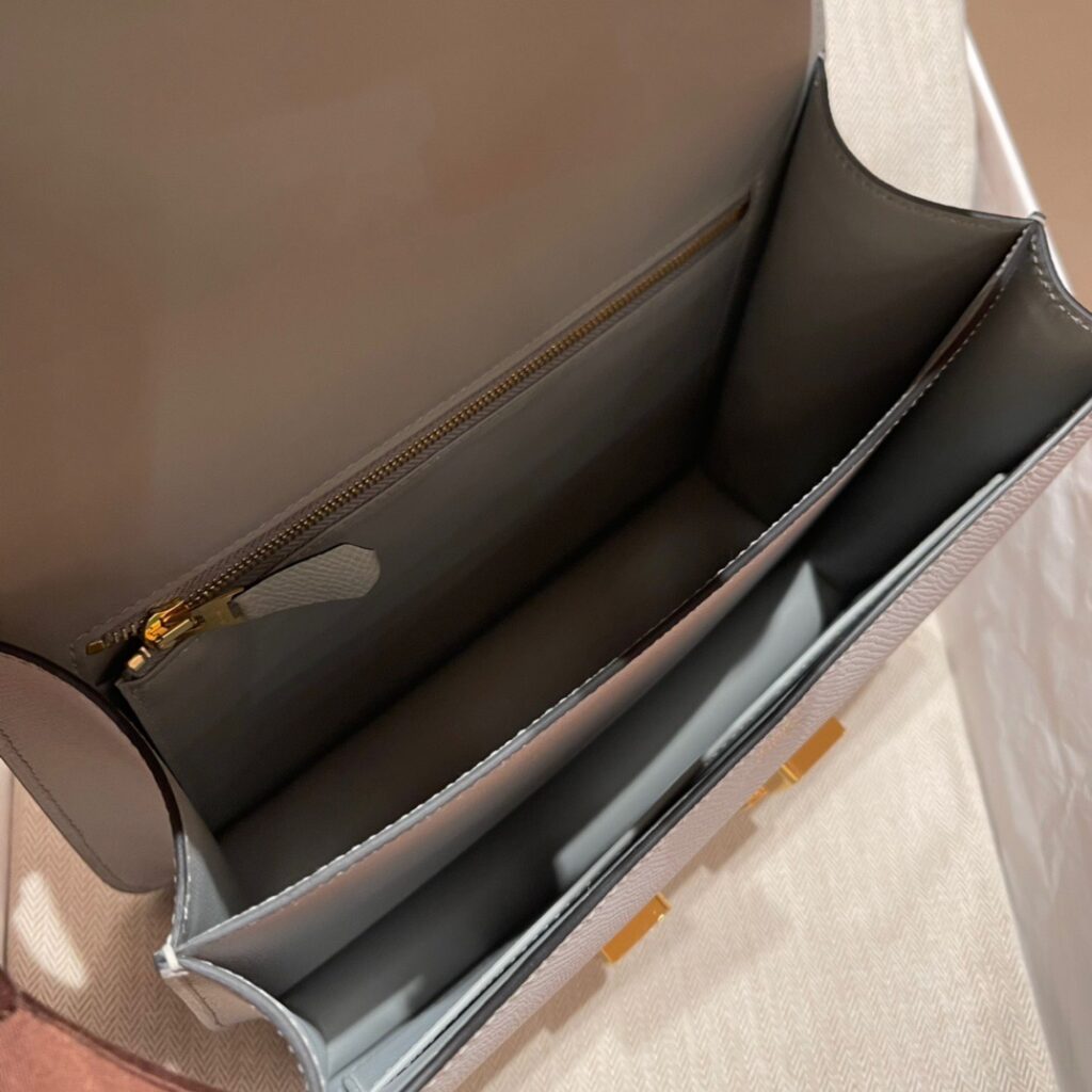 正方形の中にも丸みがある《コンスタンス》はシンプルの極みで、同時に矛盾を楽しめるバッグでもあります。長方形の《コンスタンス》は角が丸く、そのフラップにはソフトな表情を湛えます。2つのマチの部分には空気感があり、バンドリエールは自在に調節できます。