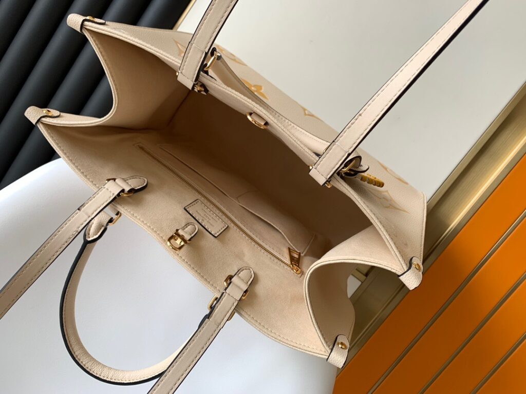 しっかりと荷物が入るトートバッグはカジュアルな印象を与えがちですが、エレガントな存在感を放つオンザゴーならそんな心配もご無用。デイリースタイルのクラスアップアイテムとしてもオススメです