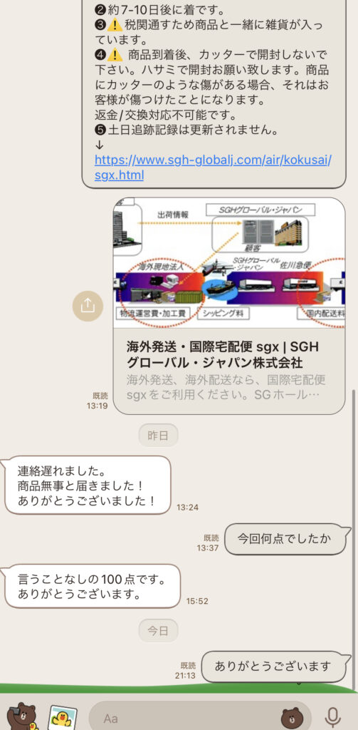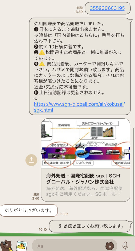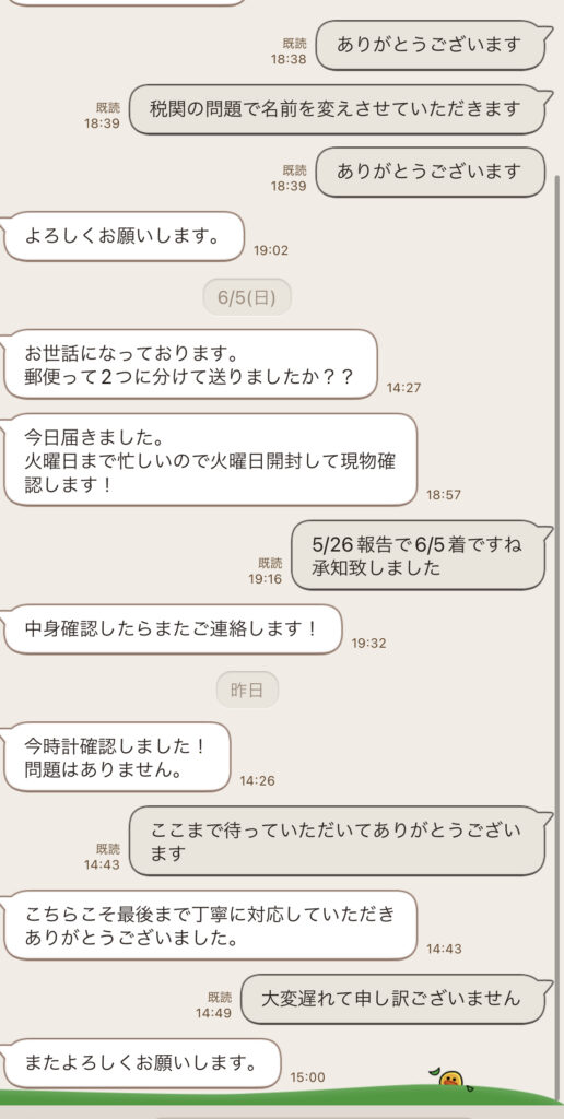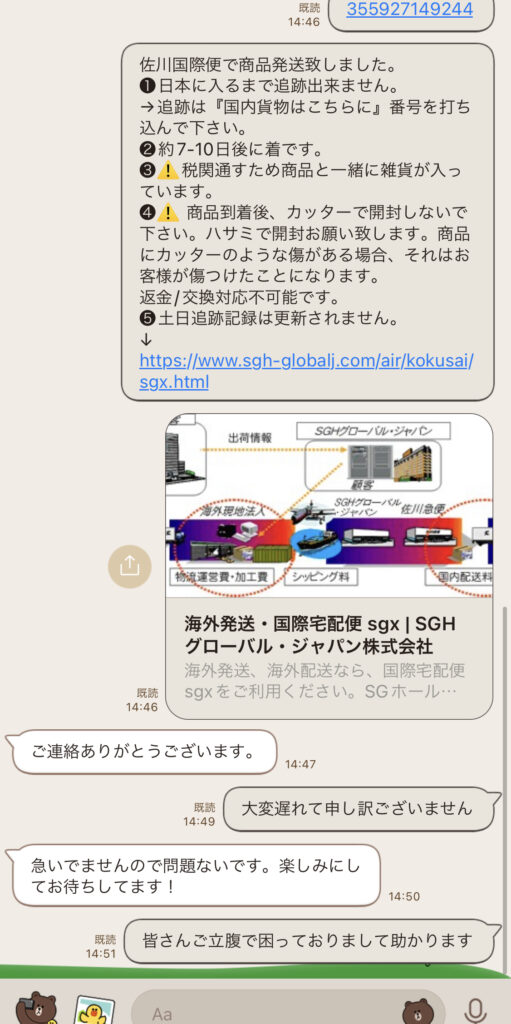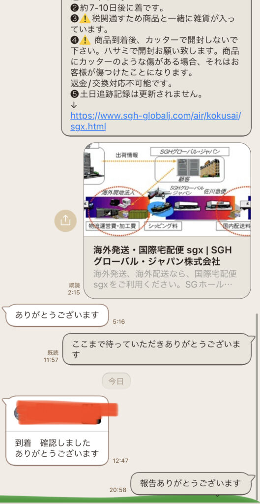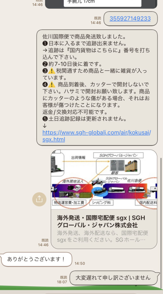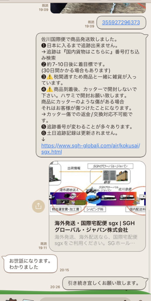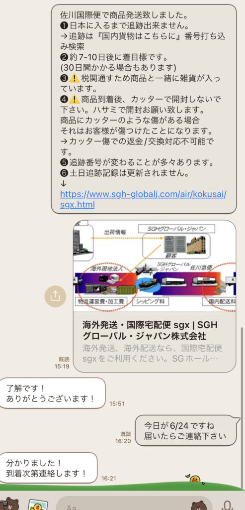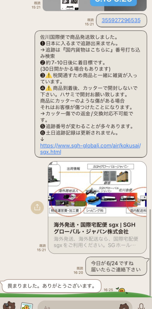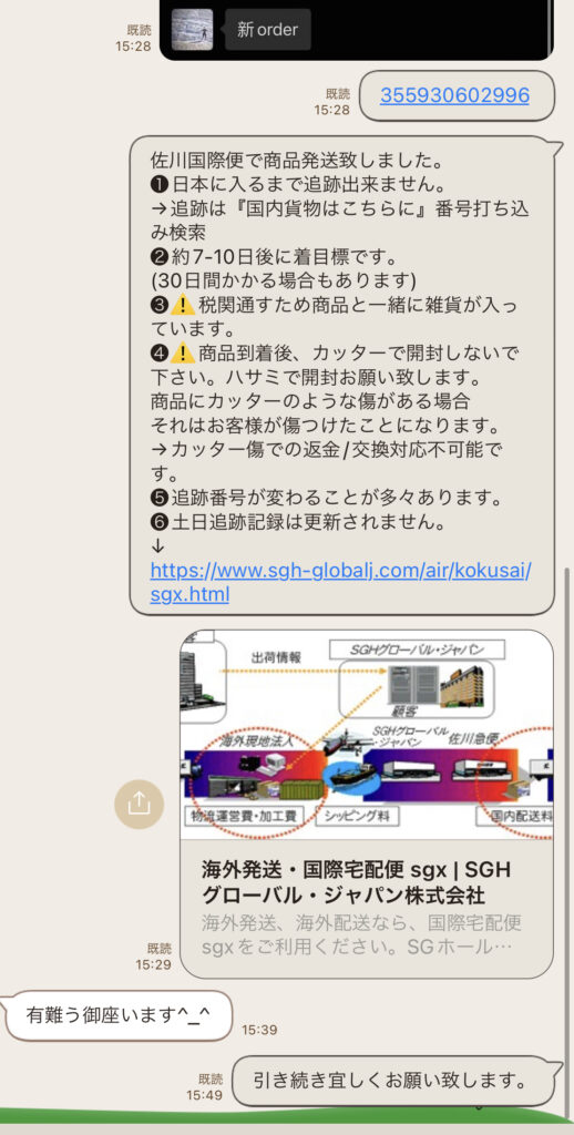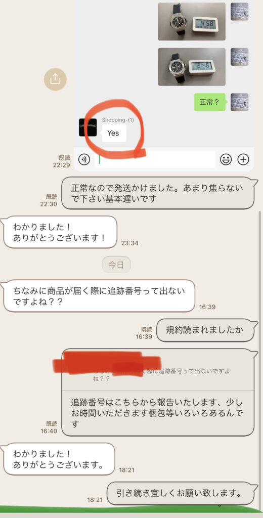 2022.6月『お客様とのやりとり』ラインで お1人様づつ丁寧に取引させていただいてます、参考までにご覧下さい。掲載されている追跡番号で本当に届いているかわかります。ご確認下さい。
