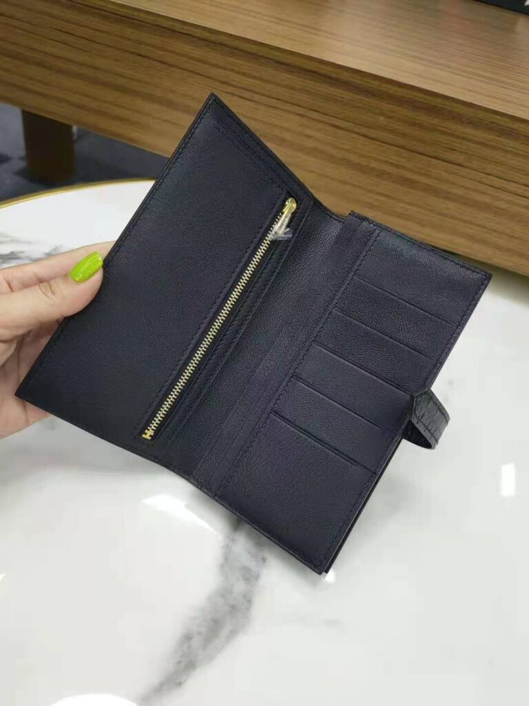スタンダードなベアンに1cmのマチをつけたものがベアンスフレ(Bearn Soufflet)です。 ポケットの数やコインケースのデザインもベアンと同じ仕様になりますが、マチがあることで入れようと思えば100枚ほどの紙幣や、通帳とパスポートなどもなんなく収納が可能。鰐皮になります。