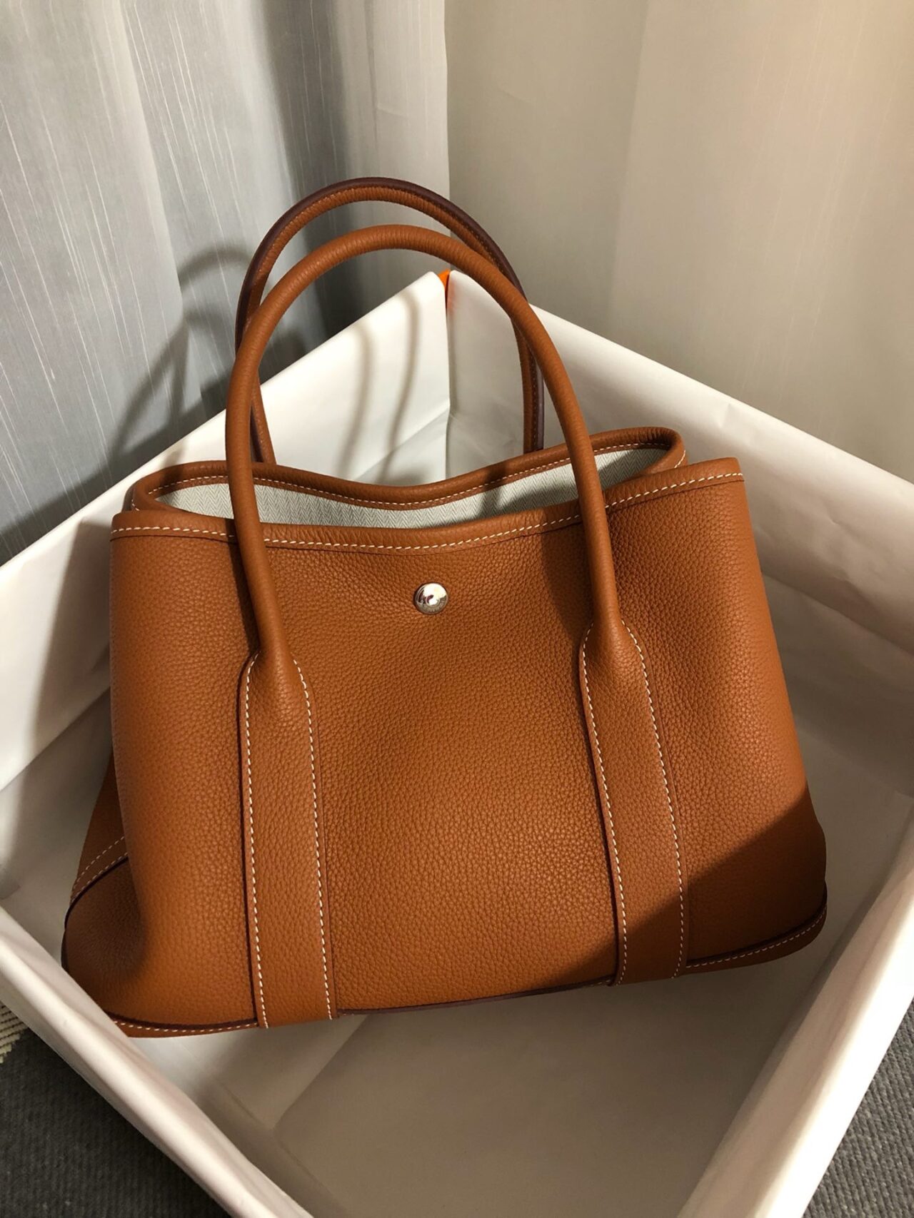 エルメス(Hermes)のガーデンパーティは、もともと園芸に使う剪定バサミやスコップなどの園芸用品を収納して持ち運ぶためにデザインされたバッグ。 見た目はシンプルなトートバッグ型ですが、上よりも下のマチ部分が少し大きめになっている台形のフォルムがフェミニンで、やわらかい印象を与えます。