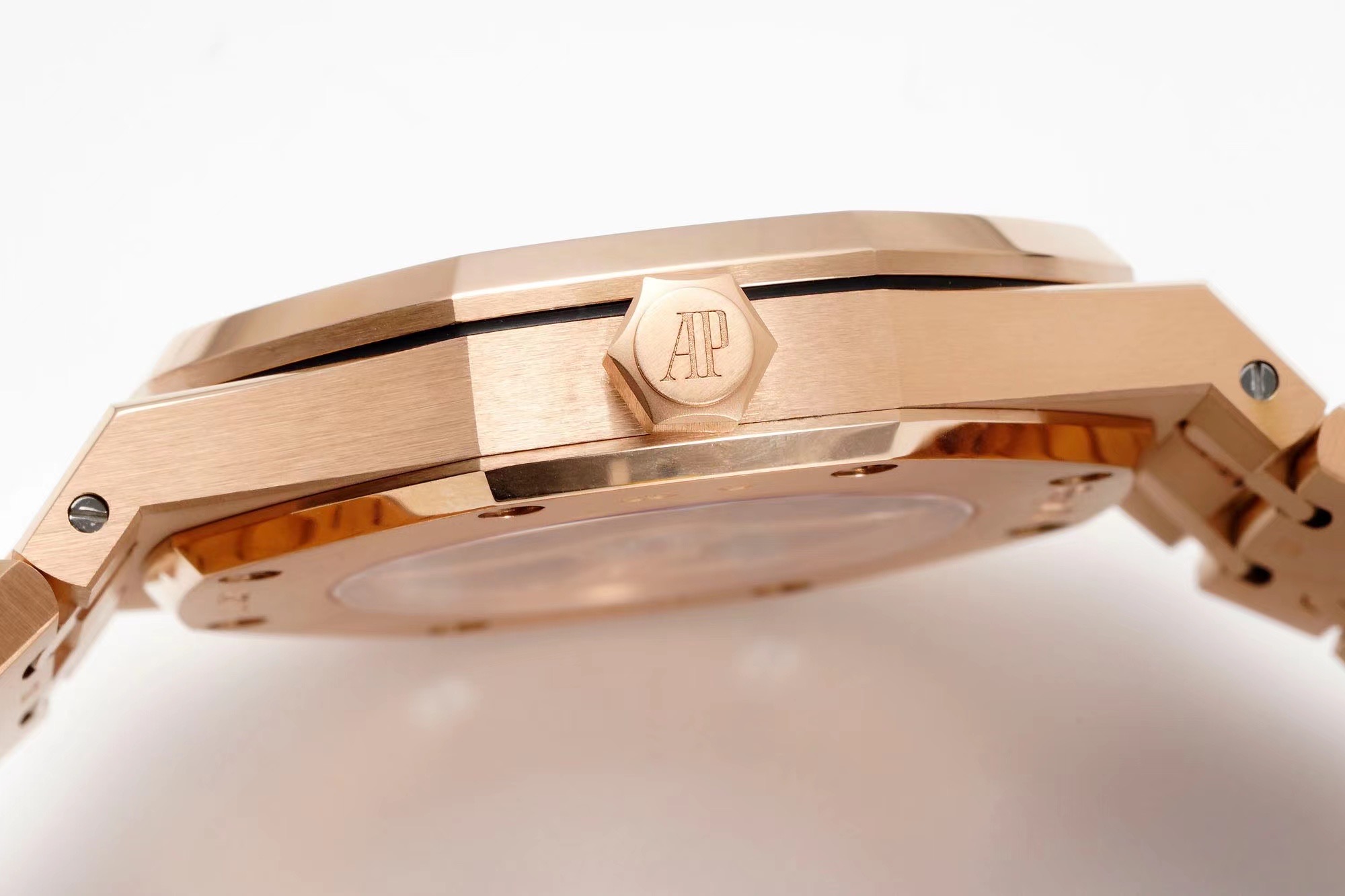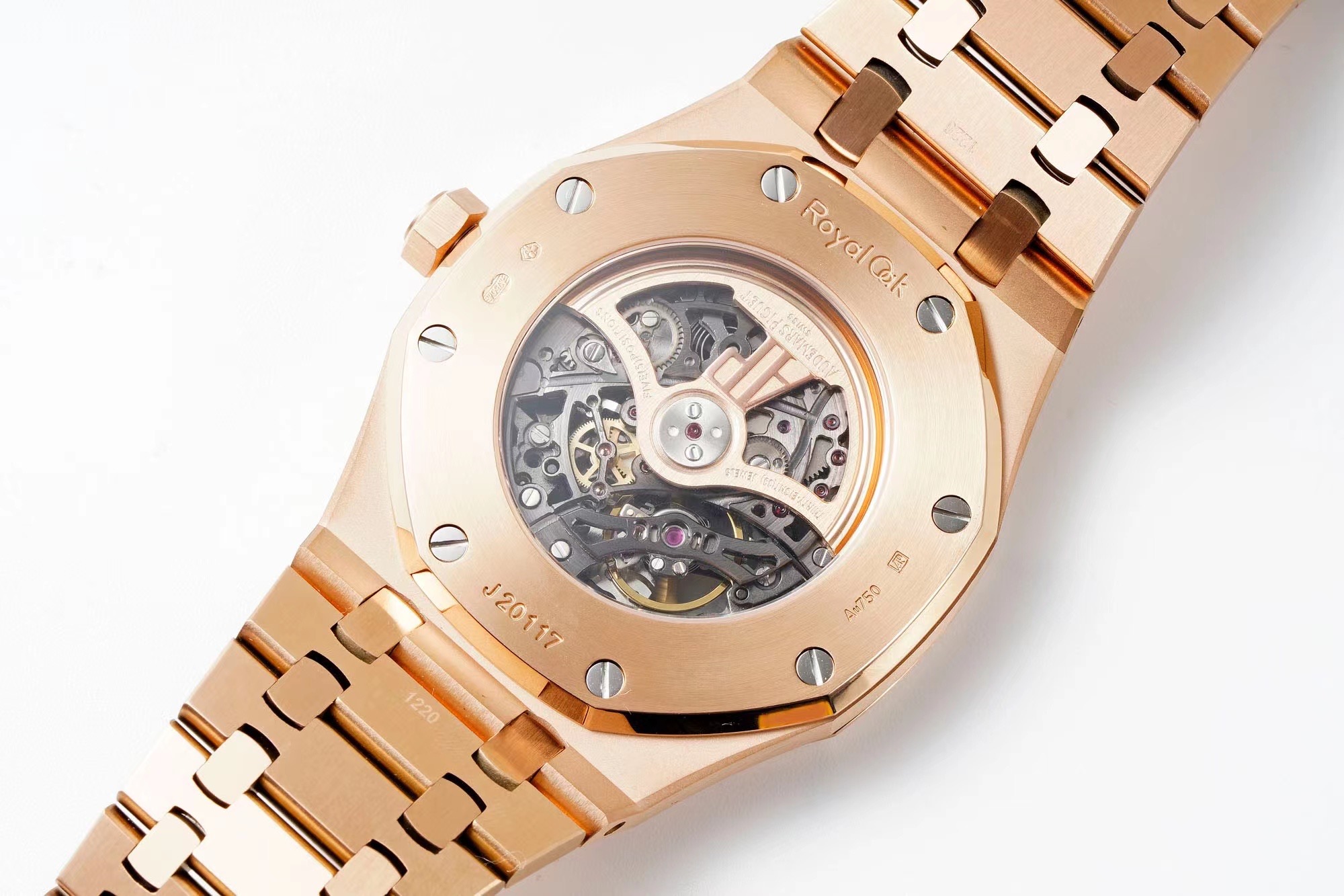 絶大なる人気を誇るブティック限定「ダブルバランスホイール オープンワーク」 誕生以来一度も創業家族の手を離れたことのない最も歴史の長い時計メーカーのオーデマ・ピゲ。 ジェラルドジェンタ氏によりデザインされ、発表当初から現在に至るまで変わらず高い人気を誇るロイヤルオークは、 スポーティかつドレッシーという新しいスタイルで「ラグジュアリースポーツウォッチ」というジャンルを確立しました。 2016年に発表されたこのモデルは「ダブルバランスホイール」という特許技術が搭載された希少モデルです。 ダブルバランスホイールとは、2010年にオーデマ・ピゲが開発し、自社製ムーブメント3132に搭載された非常に複雑な製作工程から成る機構で、2つのテンプとヒゲゼンマイが同軸上に配置されていることにより、非常に優れた精度と安定性を誇ります。 また、21,600振動のロービートにすることで、精度と安定性だけでなく耐久性にも優れています。 さらにこちらはオープンワーク、つまり文字盤も裏蓋もスケルトン仕様ですので この高性能かつ精密で美しいムーブメントを表からも裏からも堪能することができます。