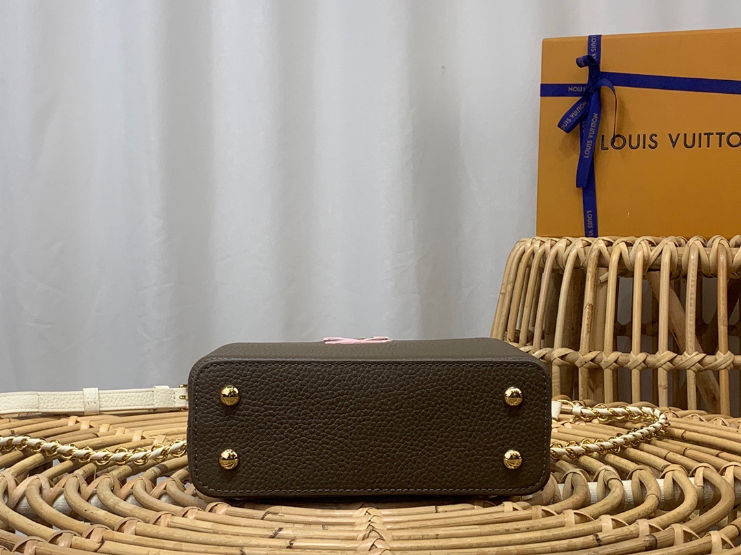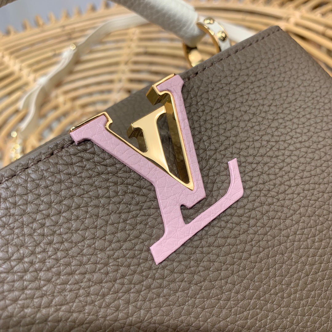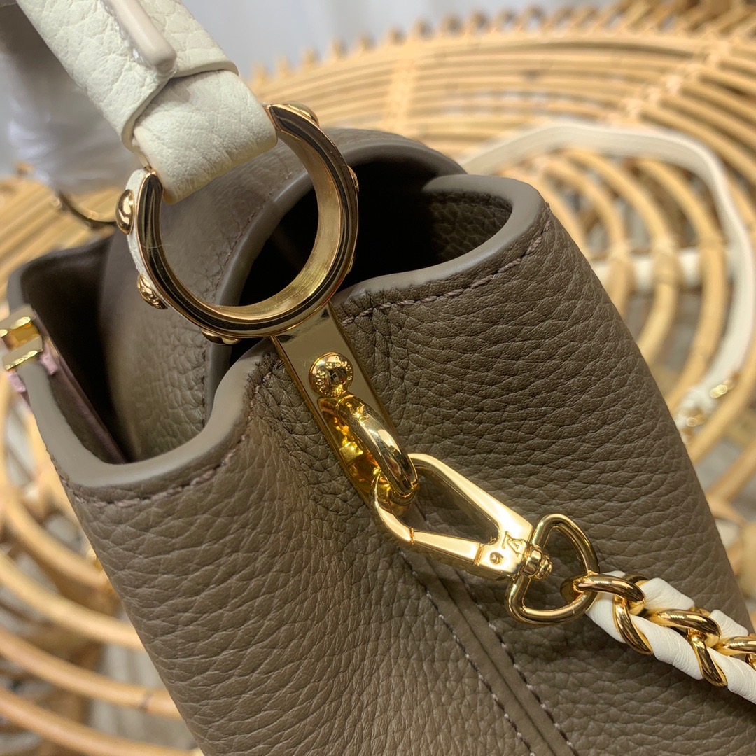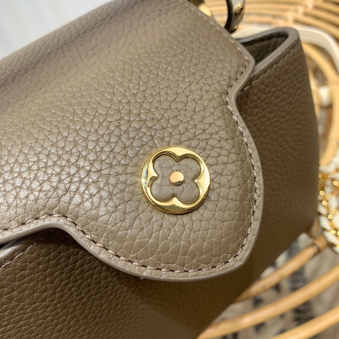 カプシーヌは、1854年にルイ・ヴィトンが始めて出店したパリのカプシーヌ通りのネーミングが由来のフラップ付きハンドバッグ。台形型のフォルムとシンプルでクラシカルなルックスが特徴のカプシーヌは、丸みを帯びたトップハンドルとハンドルをつなぐ美しいリングがとてもエレガント!そしてなんといっても、バッグの開口部分にかたどられたLVのロゴのシグネチャーが、カプシーヌの大きな魅力となっています。
