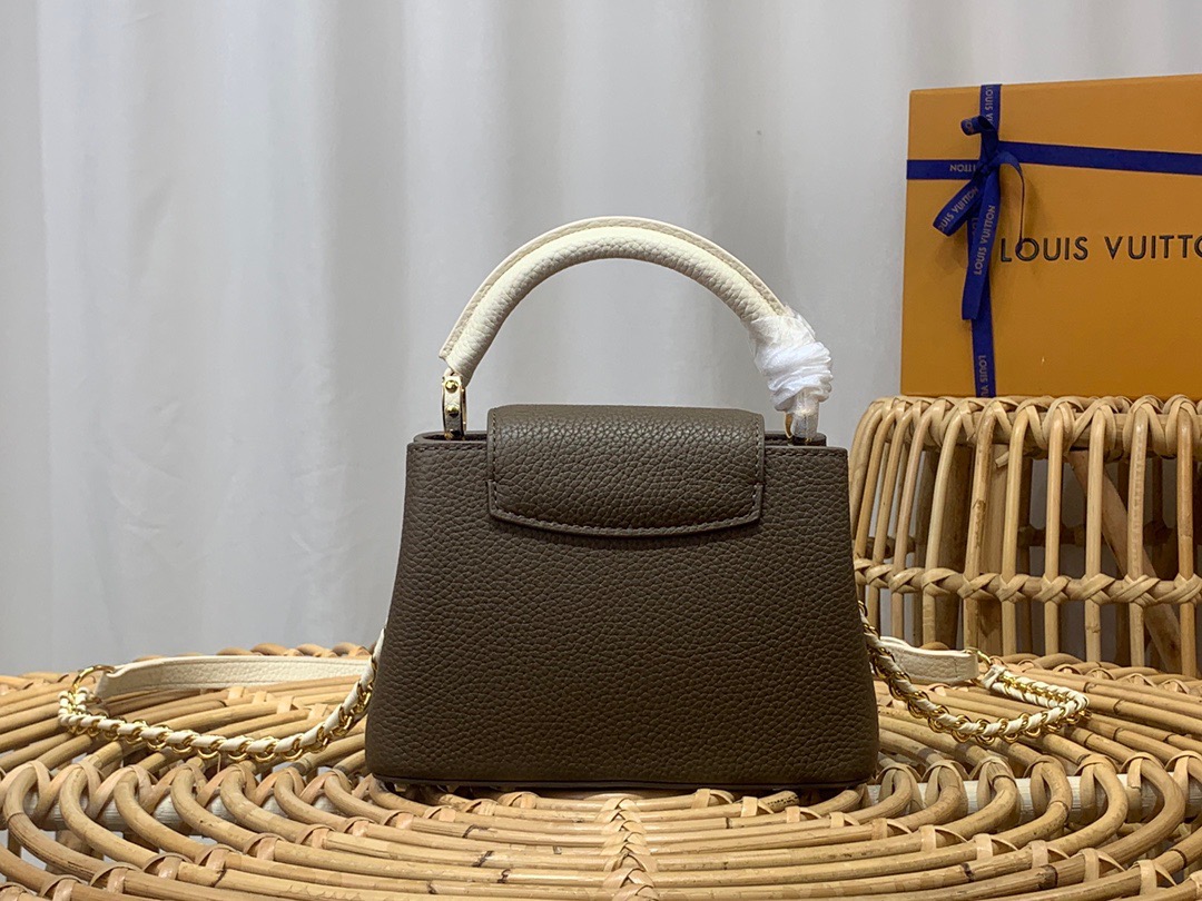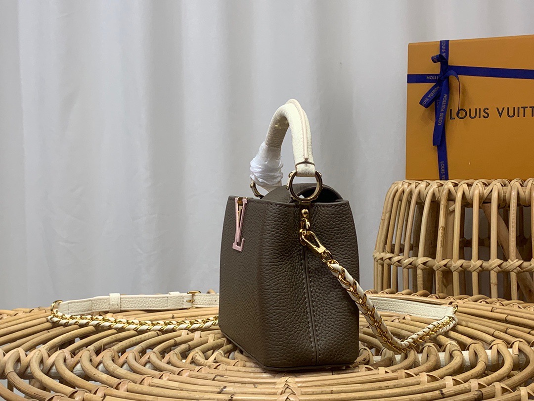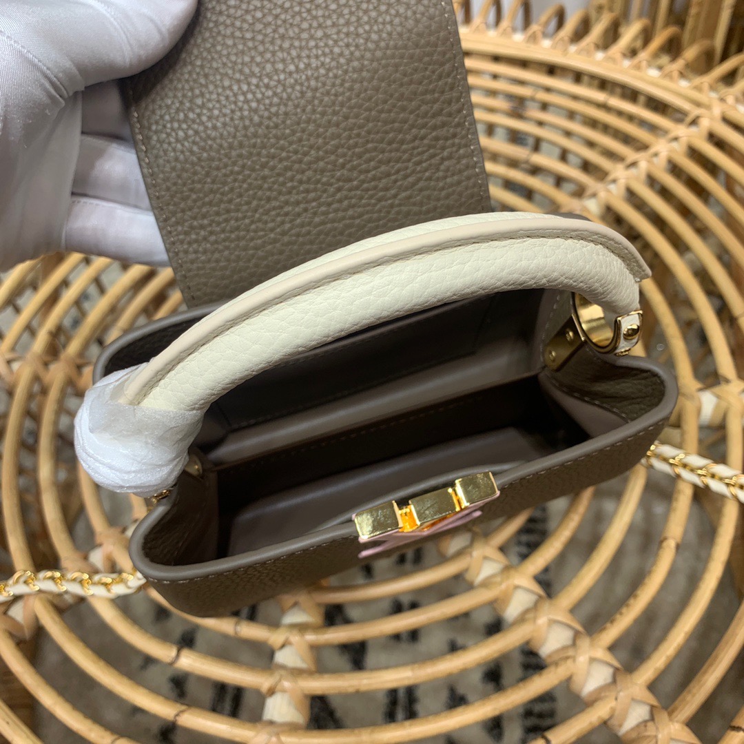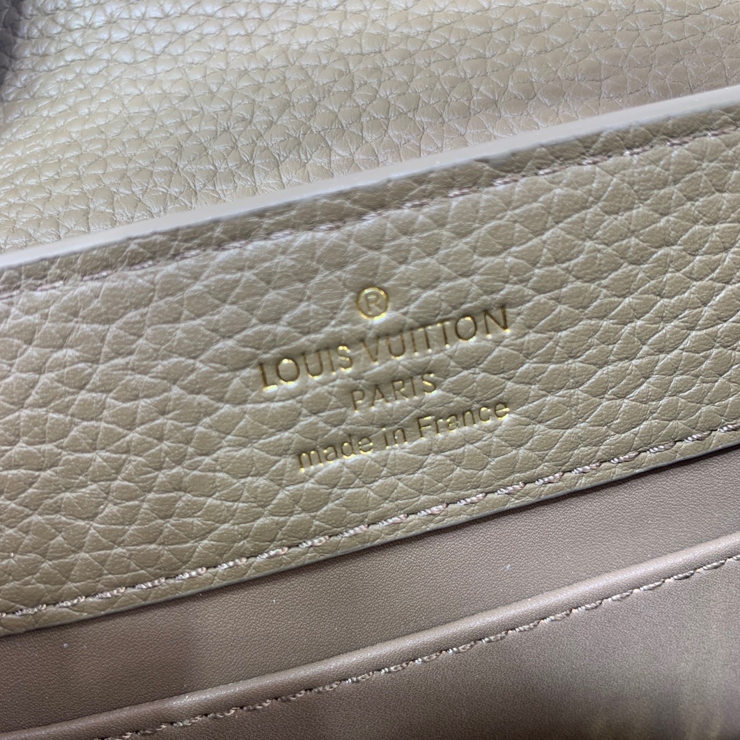 カプシーヌは、1854年にルイ・ヴィトンが始めて出店したパリのカプシーヌ通りのネーミングが由来のフラップ付きハンドバッグ。台形型のフォルムとシンプルでクラシカルなルックスが特徴のカプシーヌは、丸みを帯びたトップハンドルとハンドルをつなぐ美しいリングがとてもエレガント!そしてなんといっても、バッグの開口部分にかたどられたLVのロゴのシグネチャーが、カプシーヌの大きな魅力となっています。