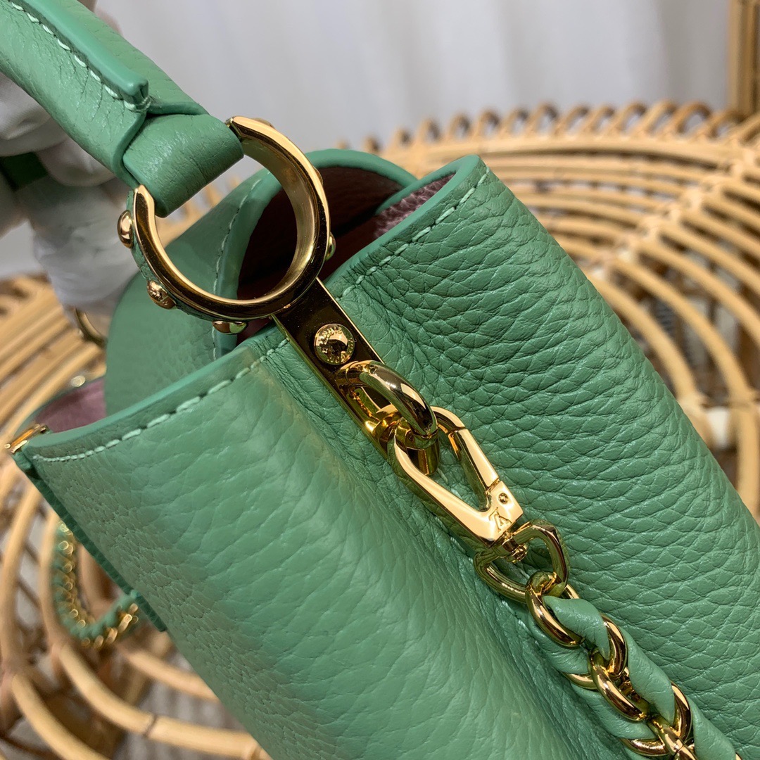 カプシーヌは、1854年にルイ・ヴィトンが始めて出店したパリのカプシーヌ通りのネーミングが由来のフラップ付きハンドバッグ。台形型のフォルムとシンプルでクラシカルなルックスが特徴のカプシーヌは、丸みを帯びたトップハンドルとハンドルをつなぐ美しいリングがとてもエレガント!そしてなんといっても、バッグの開口部分にかたどられたLVのロゴのシグネチャーが、カプシーヌの大きな魅力となっています。