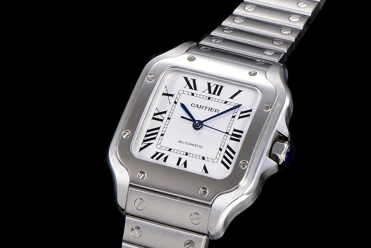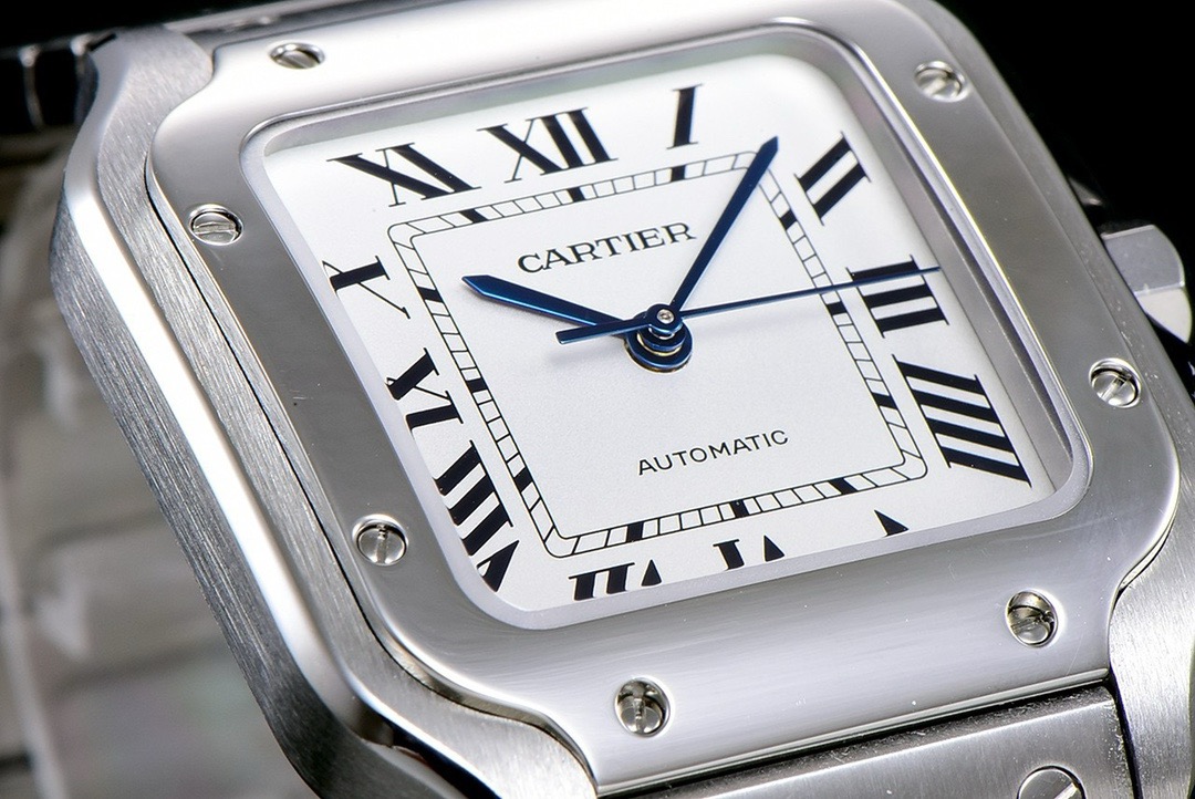 A8の新製品、SANTOS DE CARTIERのクラシックシリーズ、サイズ35mm、ステンレス製、ミドルサイズの時計。8つの外部ねじ飾りが特徴で、現代的な時計スタイルを表現し、新しいベゼルデザインが旧モデルとの違いを際立たせます。シルバーグラデーション文字盤は洗練されたファッショナブルな魅力を放ち、SANTOS DE CARTIERシリーズの大きなローマ数字時計デザインを引き継ぎ、レール式の目盛りが時間表示の明瞭さを向上させ、ブルースチールの剣型の針と組み合わせて、総合的なスタイルが男性の紳士的な雰囲気を際立たせます。側面の時計冠デザインもカルティエの象徴的なデザインで、七角形の時計冠デザインは正確な時刻合わせを可能にし、ステンレス製の素材とケースと相まって、多面的な合成ダイヤモンドが留められ、腕時計により贵重な魅力を添えています。鋼材で作られたシルバーのブレスレットは精巧で細部にこだわり、第二の交換用の小牛革のブレスレットと組み合わせられています。技術的には、QuickSwitch特許システム(ストラップ/ブレスレット)が追加され、ボタンを軽く押すだけで簡単に取り外すことができ、着用者の気分やニーズに合わせて簡単に交換できます。さらに、”SmartLink”テクノロジー(ブレスレット)が新たに追加され、ツールを使用せずにリンクを交換でき、金属リンク上のクイックリリースボタンを押すことでリンクを切断できます。非常に便利です。裏面はシールド設計で、ムーブメントを完璧に収めています。新しい時計は、カルティエ2892型ワークショップで精密に製造された自動巻き機械ムーブメントを採用し、時計全体の性能を向上させ、厳格な製造技術を表しています。