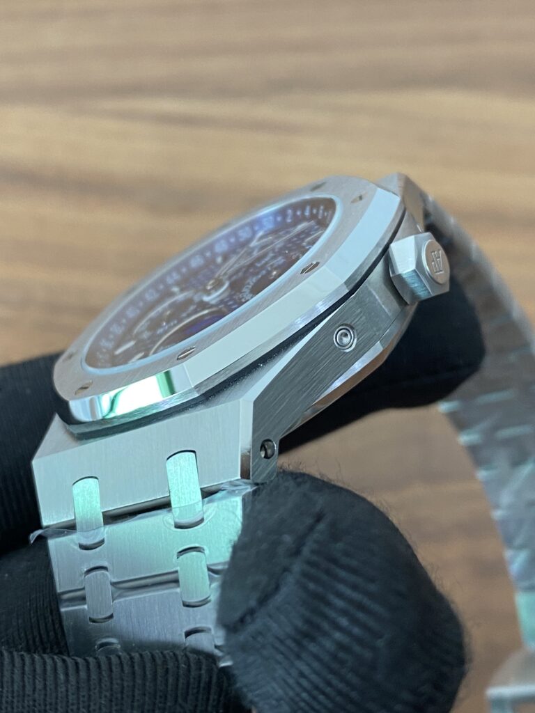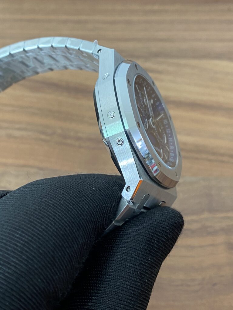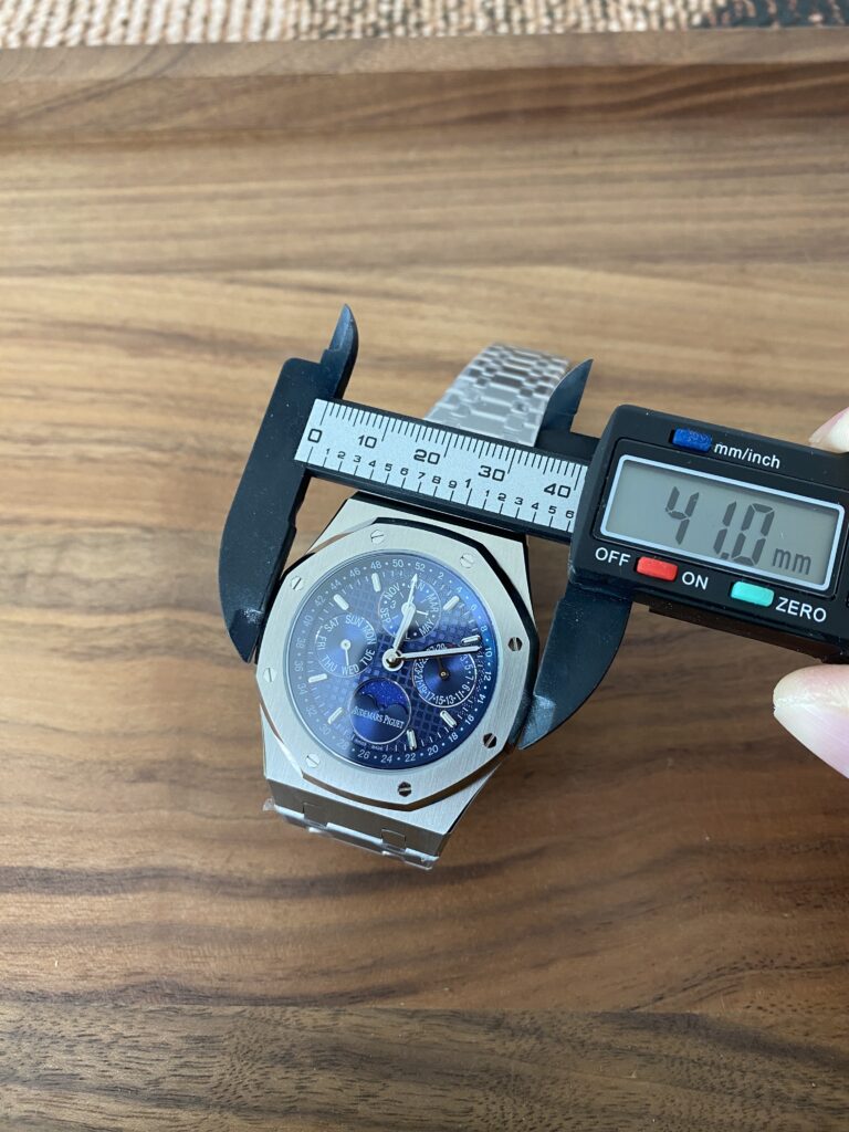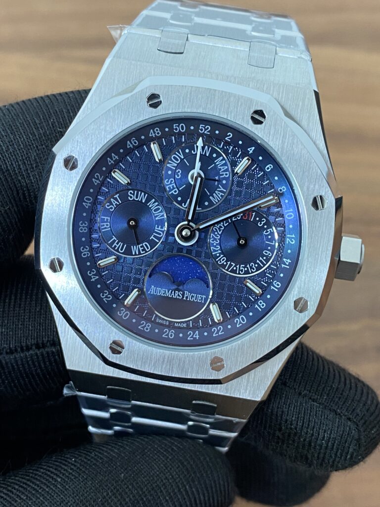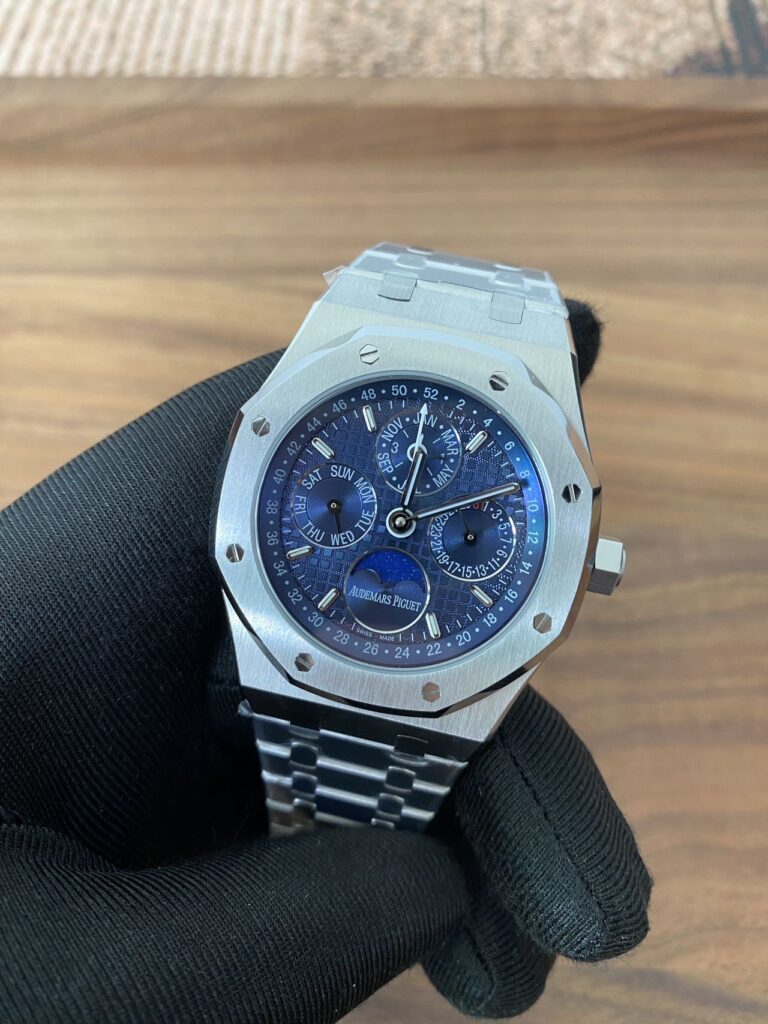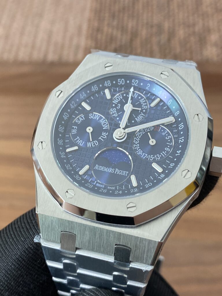 BBR愛彼のロイヤルオークシリーズは、複雑な機能を備えた永久カレンダー腕時計です。モデル番号:26574ST.OO.1220ST.03は、業界で唯一、オリジナルの機能を実現しています。貴族のための時計であり、高貴で優雅なブルーダイヤルがクールなステンレススチールケースに完璧にマッチし、愛彼の美学的デザインと複雑な機能の高度な技術を完璧に表現しています。ケースは316Lステンレススチールを採用し、直径41mm、厚さ11.4mmです。ブルーのダイヤルには「Grande Tapisserie」の大型の格子模様が刻まれており、立体的な時標と磨かれた針には夜光塗料が塗られています。3つのカレンダー機能のサブダイヤルと月相表示盤がダイヤル上に対称的に配置されており、時間、分、曜日、日付、週、月、月相、閏年情報を整然と表示しています。真のオリジナル版です。サファイア防眩処理により、全体的な時計がより透明で明るくなります。9015の1:1カスタマイズされたCalibre 5134自動巻きムーブメントを搭載しています。まさに完成度の高い製品です。この時計の型番はRef. 26574ST.OO.1220ST.03です。