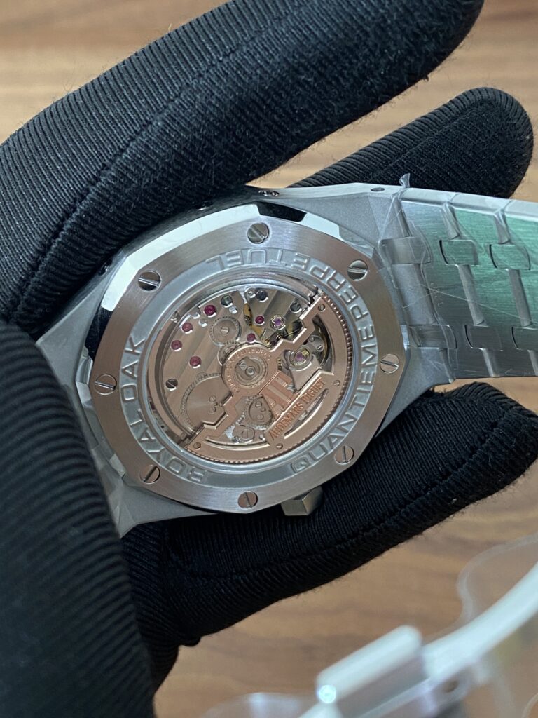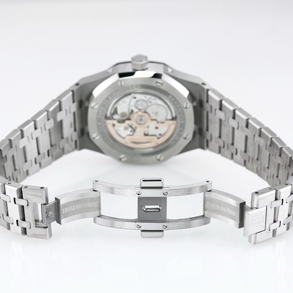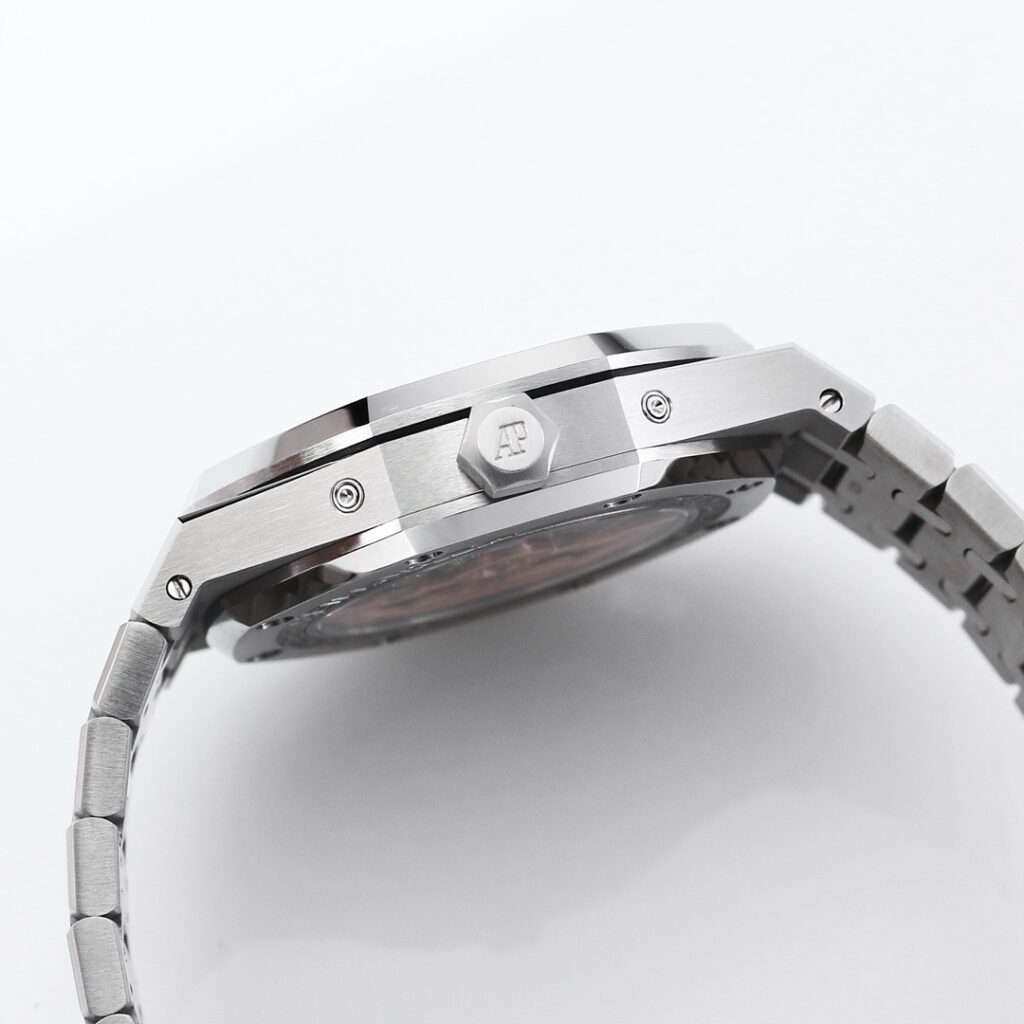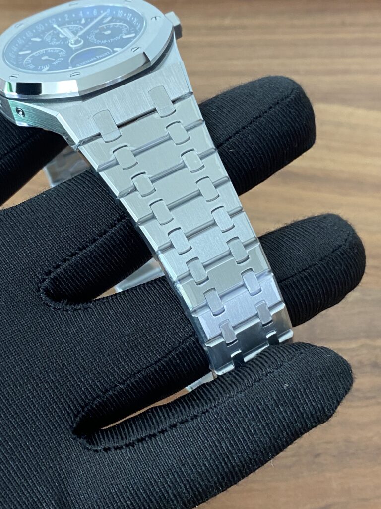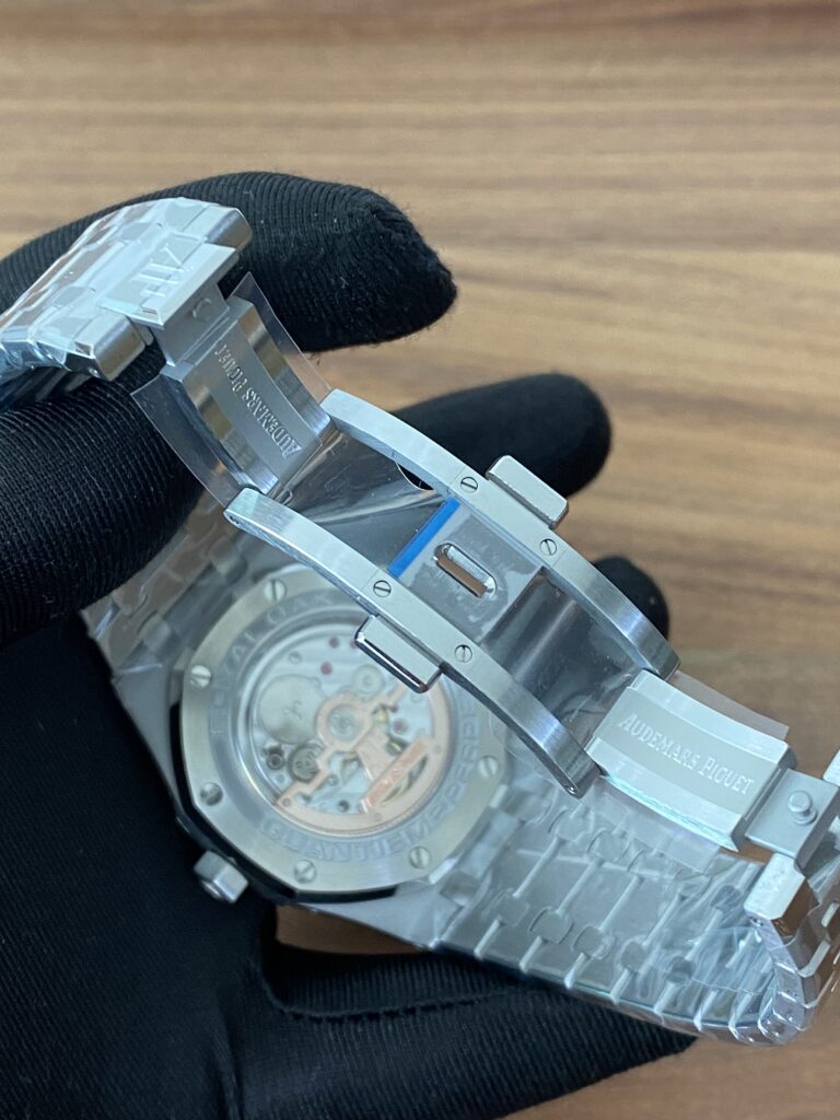 BBR愛彼のロイヤルオークシリーズは、複雑な機能を備えた永久カレンダー腕時計です。モデル番号:26574ST.OO.1220ST.03は、業界で唯一、オリジナルの機能を実現しています。貴族のための時計であり、高貴で優雅なブルーダイヤルがクールなステンレススチールケースに完璧にマッチし、愛彼の美学的デザインと複雑な機能の高度な技術を完璧に表現しています。ケースは316Lステンレススチールを採用し、直径41mm、厚さ11.4mmです。ブルーのダイヤルには「Grande Tapisserie」の大型の格子模様が刻まれており、立体的な時標と磨かれた針には夜光塗料が塗られています。3つのカレンダー機能のサブダイヤルと月相表示盤がダイヤル上に対称的に配置されており、時間、分、曜日、日付、週、月、月相、閏年情報を整然と表示しています。真のオリジナル版です。サファイア防眩処理により、全体的な時計がより透明で明るくなります。9015の1:1カスタマイズされたCalibre 5134自動巻きムーブメントを搭載しています。まさに完成度の高い製品です。この時計の型番はRef. 26574ST.OO.1220ST.03です。