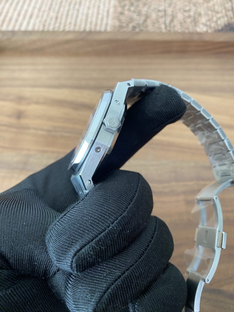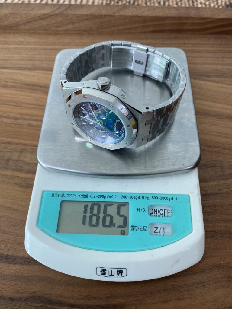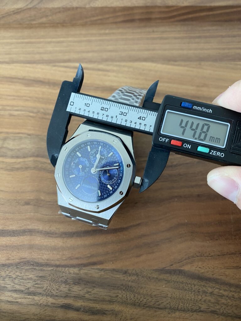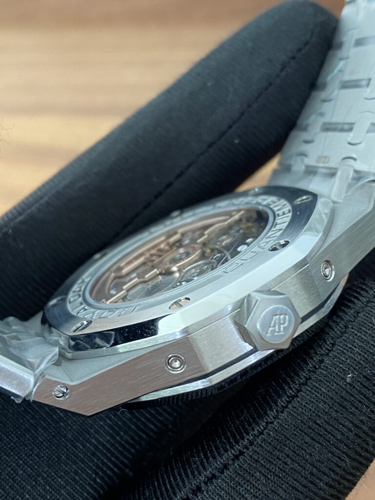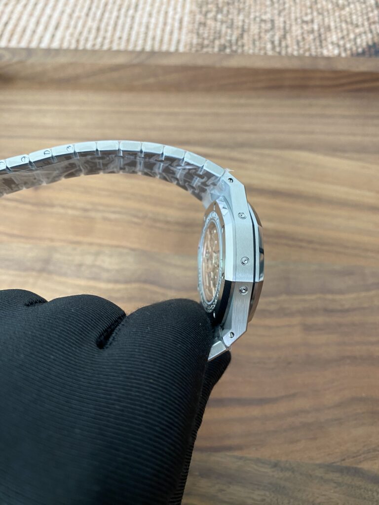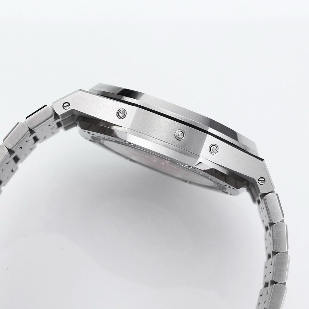 BBR愛彼のロイヤルオークシリーズは、複雑な機能を備えた永久カレンダー腕時計です。モデル番号:26574ST.OO.1220ST.03は、業界で唯一、オリジナルの機能を実現しています。貴族のための時計であり、高貴で優雅なブルーダイヤルがクールなステンレススチールケースに完璧にマッチし、愛彼の美学的デザインと複雑な機能の高度な技術を完璧に表現しています。ケースは316Lステンレススチールを採用し、直径41mm、厚さ11.4mmです。ブルーのダイヤルには「Grande Tapisserie」の大型の格子模様が刻まれており、立体的な時標と磨かれた針には夜光塗料が塗られています。3つのカレンダー機能のサブダイヤルと月相表示盤がダイヤル上に対称的に配置されており、時間、分、曜日、日付、週、月、月相、閏年情報を整然と表示しています。真のオリジナル版です。サファイア防眩処理により、全体的な時計がより透明で明るくなります。9015の1:1カスタマイズされたCalibre 5134自動巻きムーブメントを搭載しています。まさに完成度の高い製品です。この時計の型番はRef. 26574ST.OO.1220ST.03です。