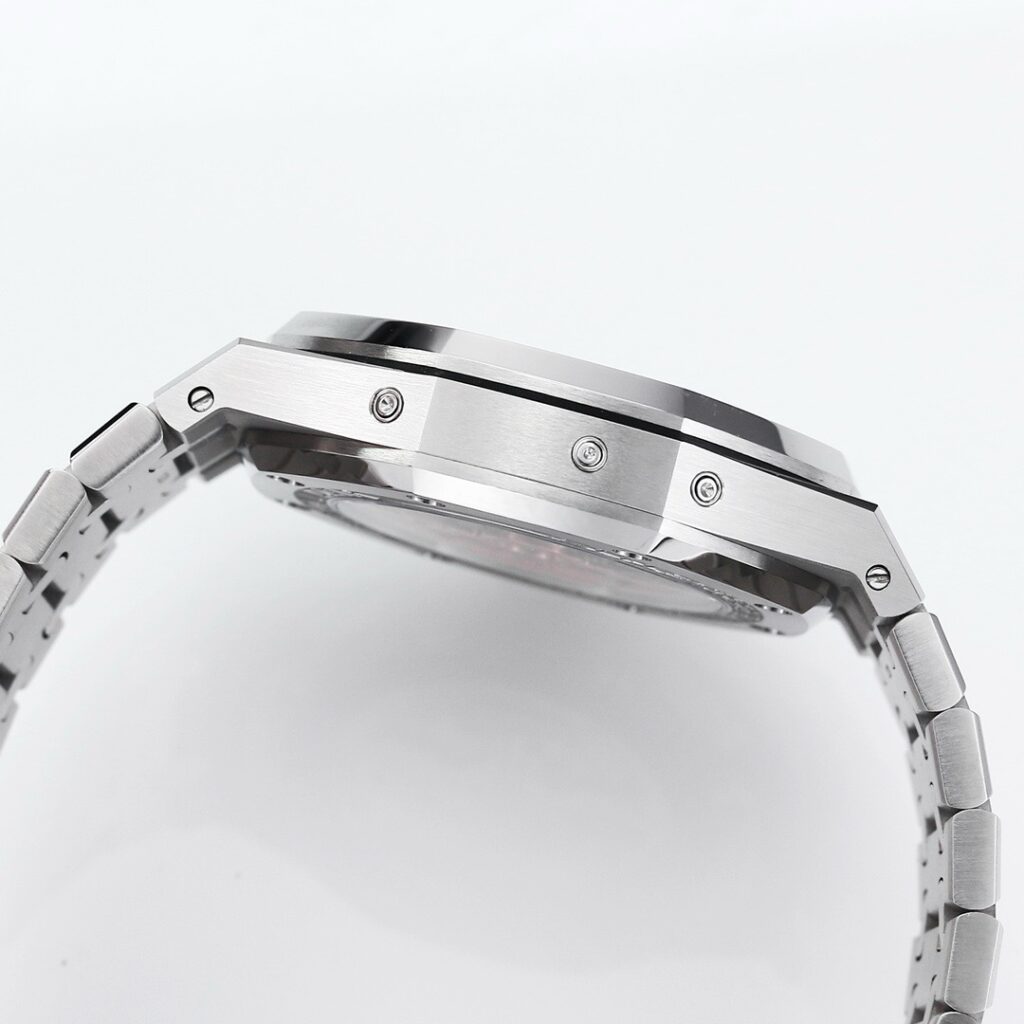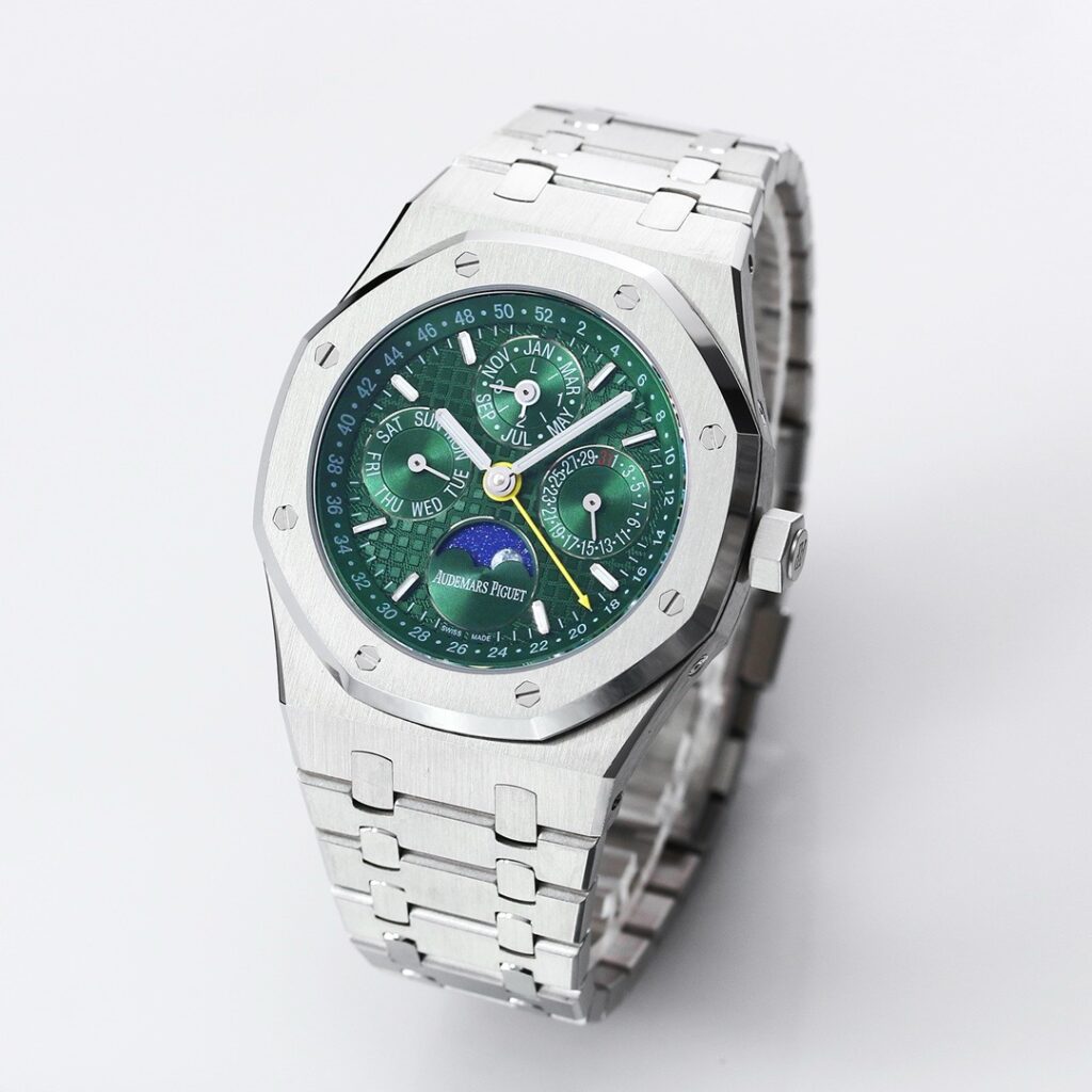 BBR愛彼のロイヤルオークシリーズは、複雑な機能を備えた永久カレンダー腕時計です。モデル番号:26574ST.OO.1220ST.03は、業界で唯一、オリジナルの機能を実現しています。貴族のための時計であり、高貴で優雅なブルーダイヤルがクールなステンレススチールケースに完璧にマッチし、愛彼の美学的デザインと複雑な機能の高度な技術を完璧に表現しています。ケースは316Lステンレススチールを採用し、直径41mm、厚さ11.4mmです。ブルーのダイヤルには「Grande Tapisserie」の大型の格子模様が刻まれており、立体的な時標と磨かれた針には夜光塗料が塗られています。3つのカレンダー機能のサブダイヤルと月相表示盤がダイヤル上に対称的に配置されており、時間、分、曜日、日付、週、月、月相、閏年情報を整然と表示しています。真のオリジナル版です。サファイア防眩処理により、全体的な時計がより透明で明るくなります。9015の1:1カスタマイズされたCalibre 5134自動巻きムーブメントを搭載しています。まさに完成度の高い製品です。この時計の型番はRef. 26574ST.OO.1220ST.03です。