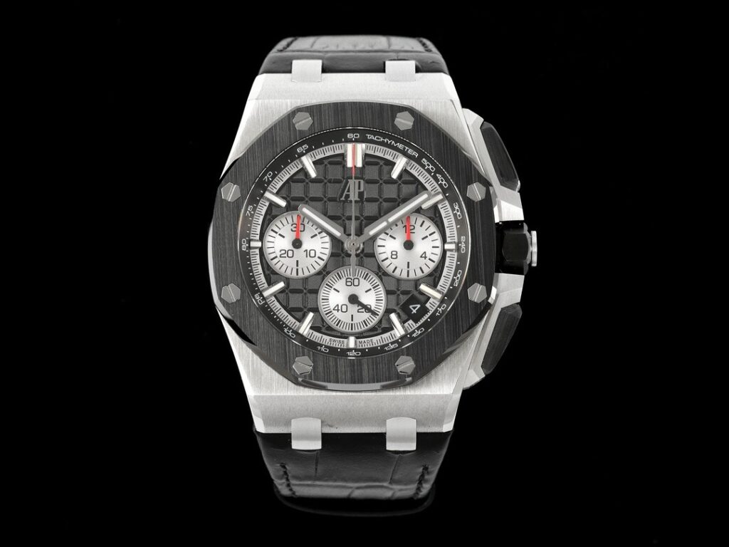 チタンバージョン以外では、ロイヤルオーク オフショア クロノグラフ 43mmは、素材と色で鮮明なコントラストを形成する黒いセラミックベゼルを採用しています。王冠とボタンもセラミック素材で作られています。