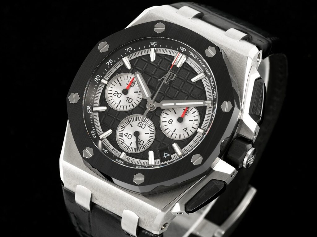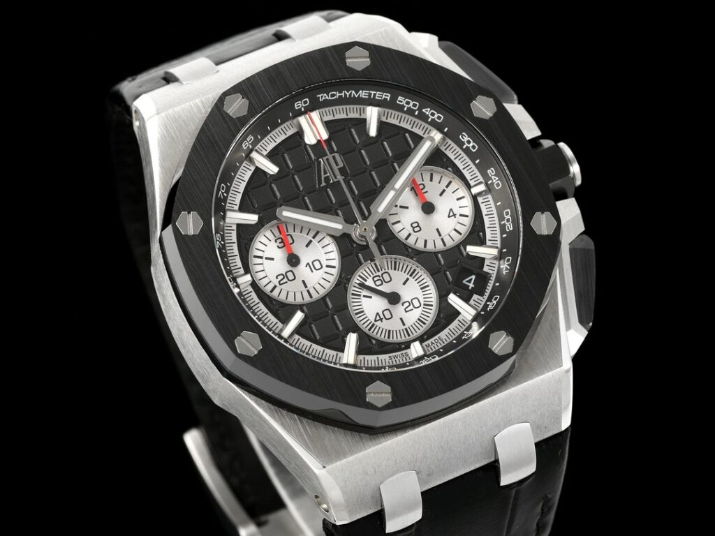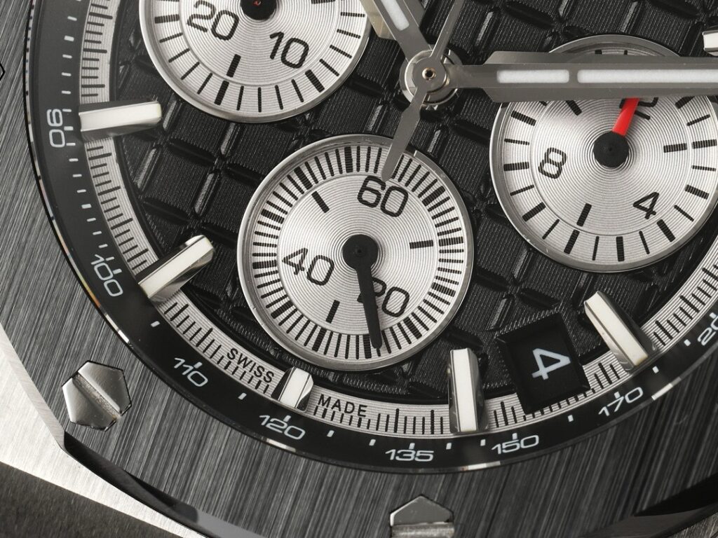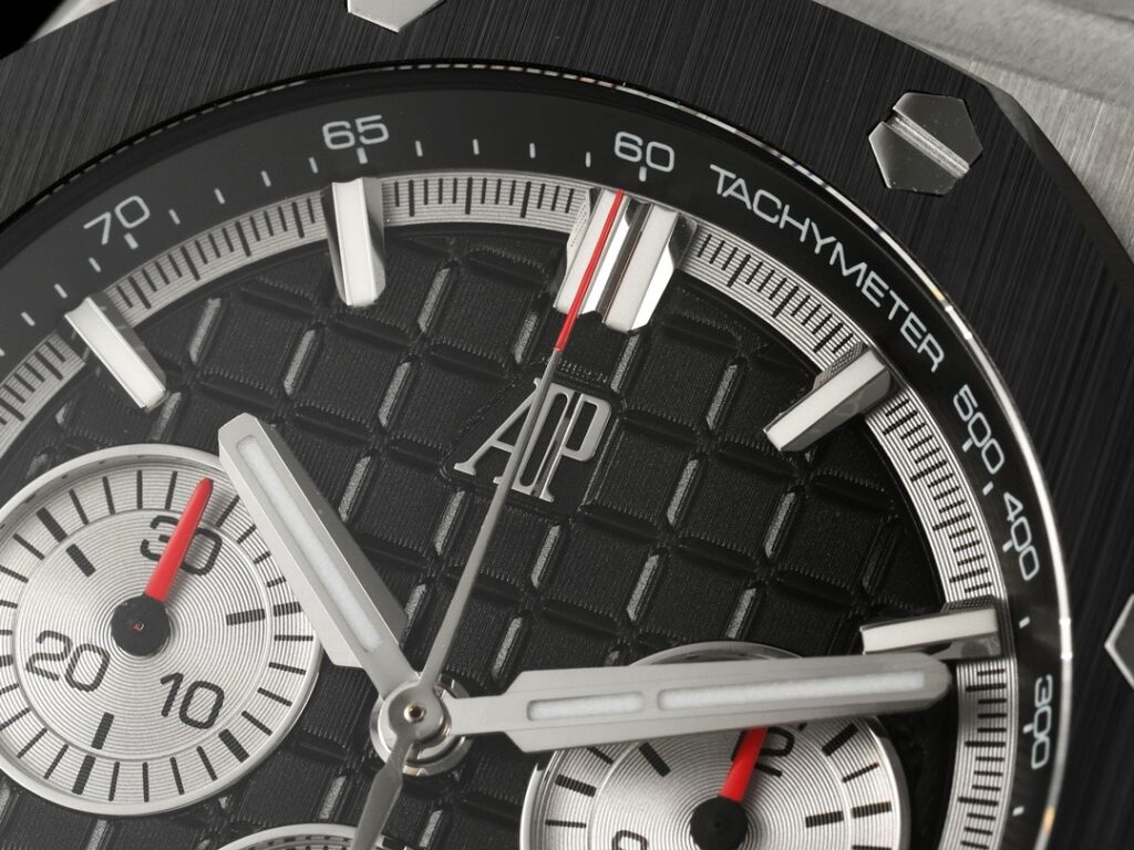チタンバージョン以外では、ロイヤルオーク オフショア クロノグラフ 43mmは、素材と色で鮮明なコントラストを形成する黒いセラミックベゼルを採用しています。