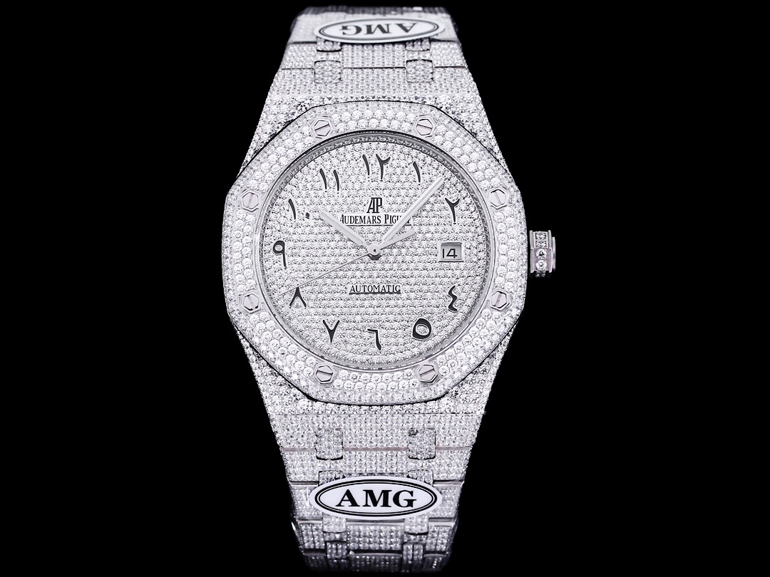 APオーデマ・ピゲ ロイヤルオーク15400スターダスト 豪華さの極み 実物は超きらびやかで、誰もがスターダストの豪華さを体験できます。AMGは数々の工芸技術を経て、ついに大成!全体に最高級のスワロフスキークリスタルダイヤモンドを密に散りばめ、ブレスレットの側面にもダイヤモンドを全面的にセットしました。何度もの加工技術を試み、極限の豪華さを追求した圧倒的な質感を実現!費用を惜しまず、現在最も豪華な15400スターダストを創り出しました。AMGは他の既存のバージョンを細部と作りの面で圧倒!AMG大手独自の細かいディテールに注目。ダイヤルとブレスレットの側面にダイヤモンドをふんだんに使用。 ケースサイズは41mm、ムーブメントには9015をベースにしたCAL.3120ムーブメントを採用。誰もがスターダストの豪華さを体験できるように! AMG出品、ぜひご高覧ください