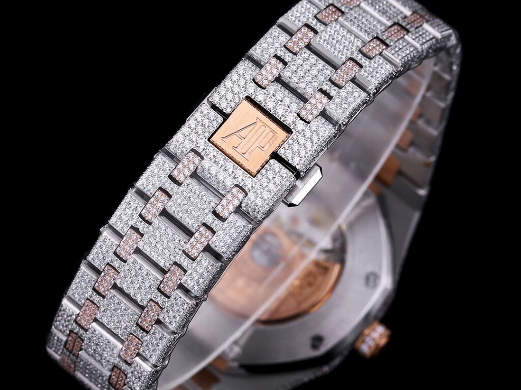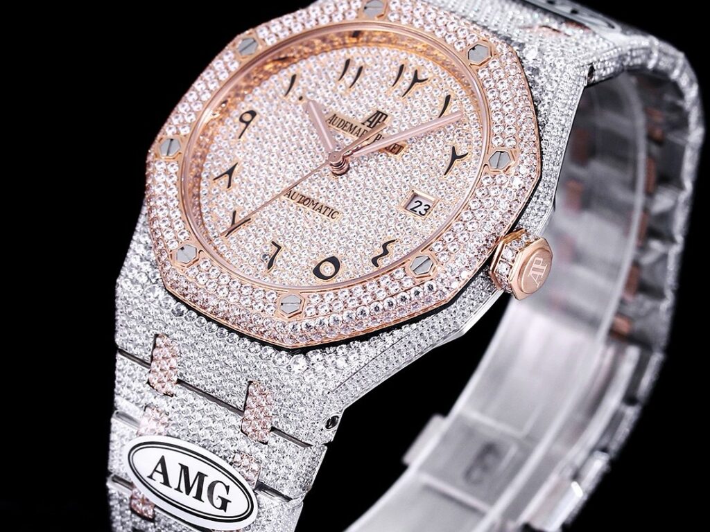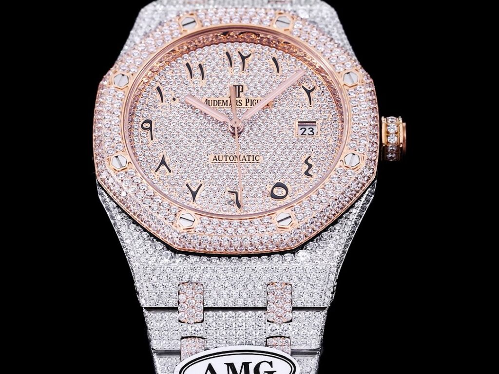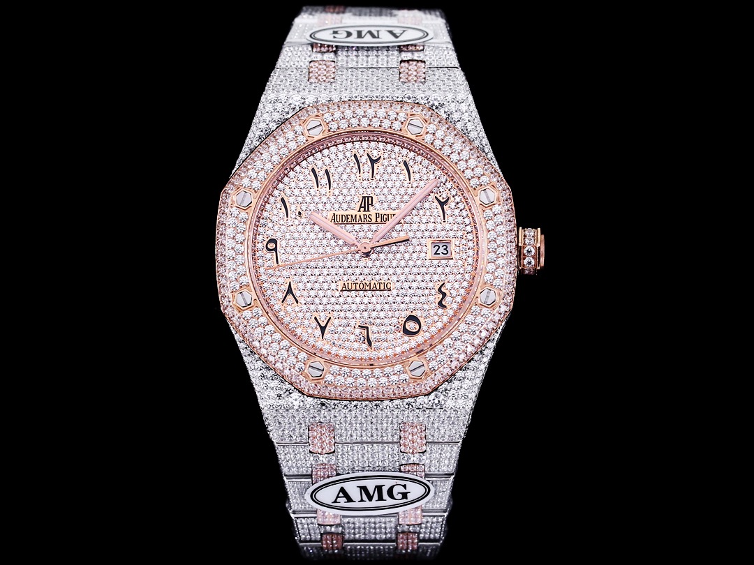 APオーデマ・ピゲ ロイヤルオーク15400スターダスト 豪華さの極み 実物は超きらびやかで、誰もがスターダストの豪華さを体験できます。AMGは数々の工芸技術を経て、ついに大成!全体に最高級のスワロフスキークリスタルダイヤモンドを密に散りばめ、ブレスレットの側面にもダイヤモンドを全面的にセットしました。何度もの加工技術を試み、極限の豪華さを追求した圧倒的な質感を実現!費用を惜しまず、現在最も豪華な15400スターダストを創り出しました。AMGは他の既存のバージョンを細部と作りの面で圧倒!AMG大手独自の細かいディテールに注目。ダイヤルとブレスレットの側面にダイヤモンドをふんだんに使用。 ケースサイズは41mm、ムーブメントには9015をベースにしたCAL.3120ムーブメントを採用。誰もがスターダストの豪華さを体験できるように! AMG出品、ぜひご高覧ください