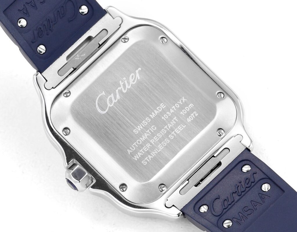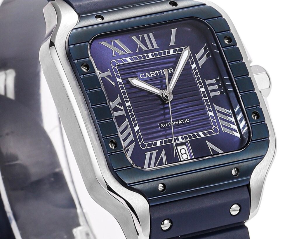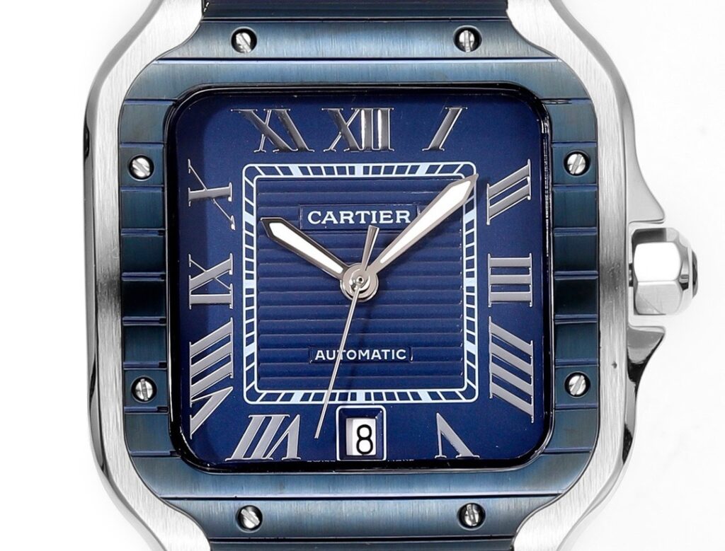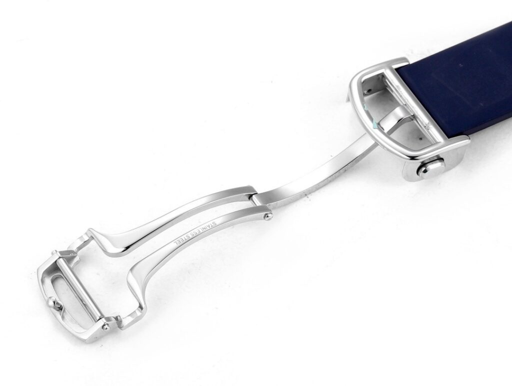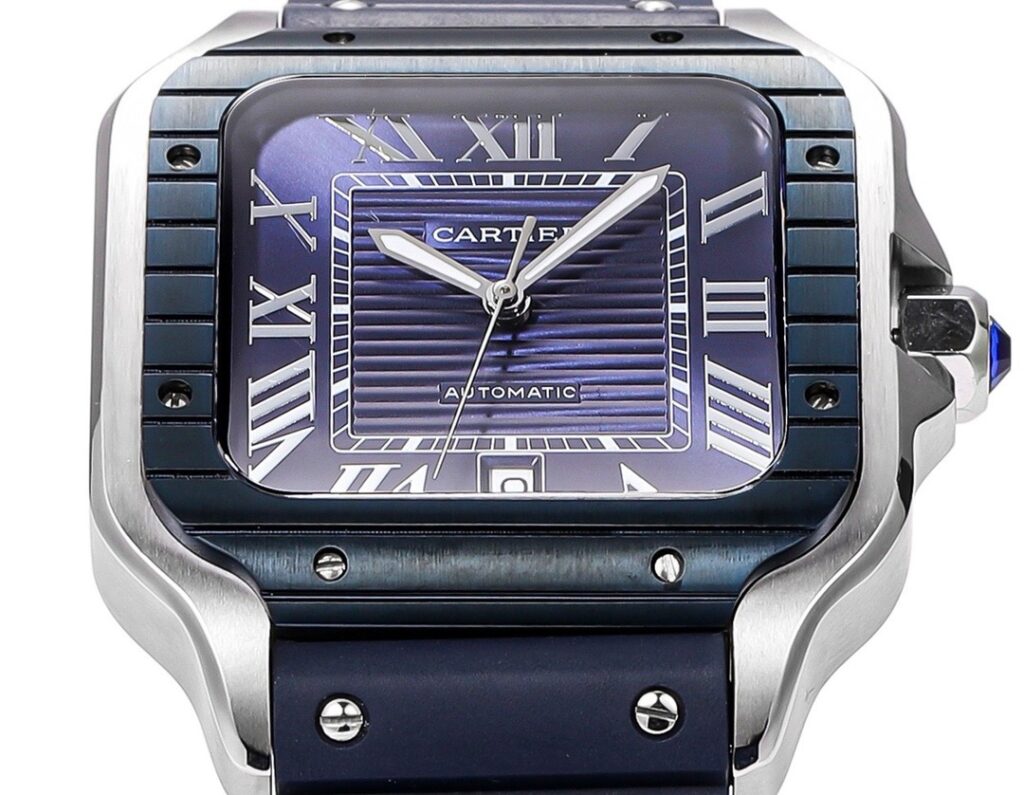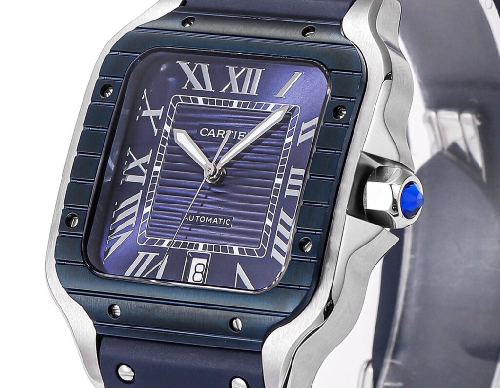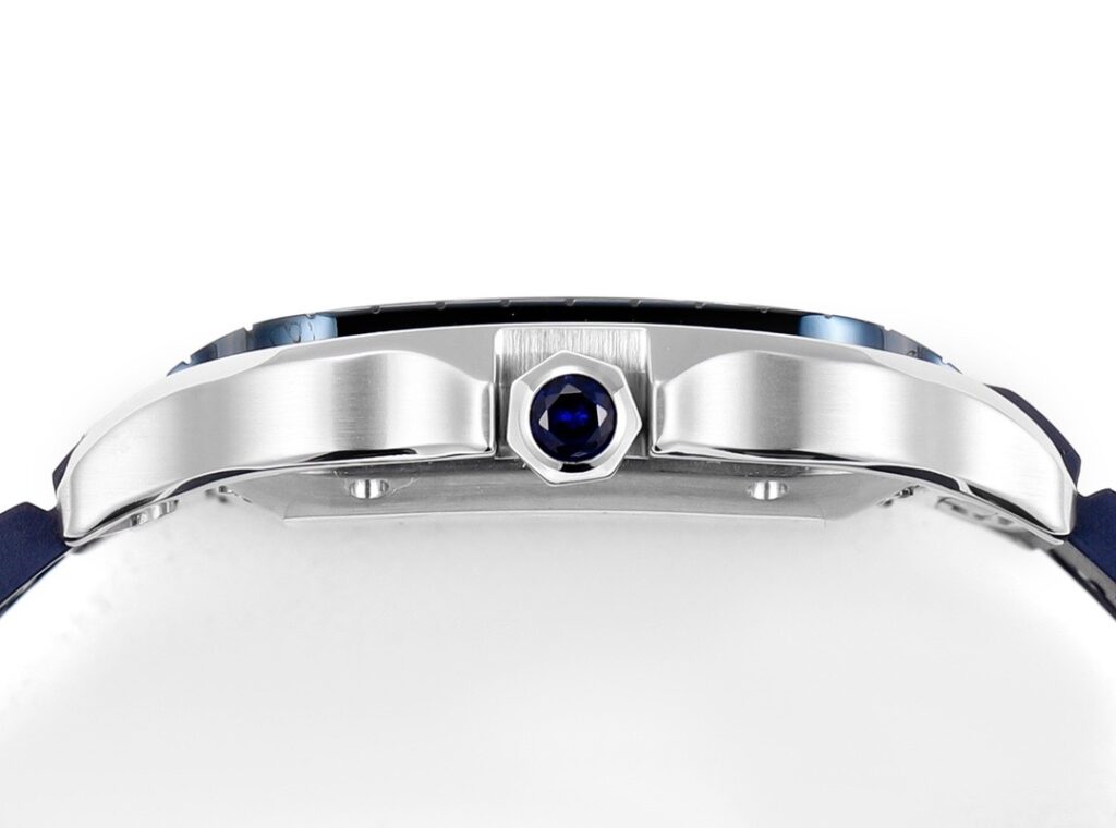 【リューズ】多面カットのブルーサファイア 1:1開模、オリジナルのパーツと交換可能。カルティエの実用的な2つの発明「SmartLink」ブレスレット調整装置と「QuickSwitch」ストラップ素早く交換装置付き!【ケース直径:39.8mm、厚さ:9.08mm】