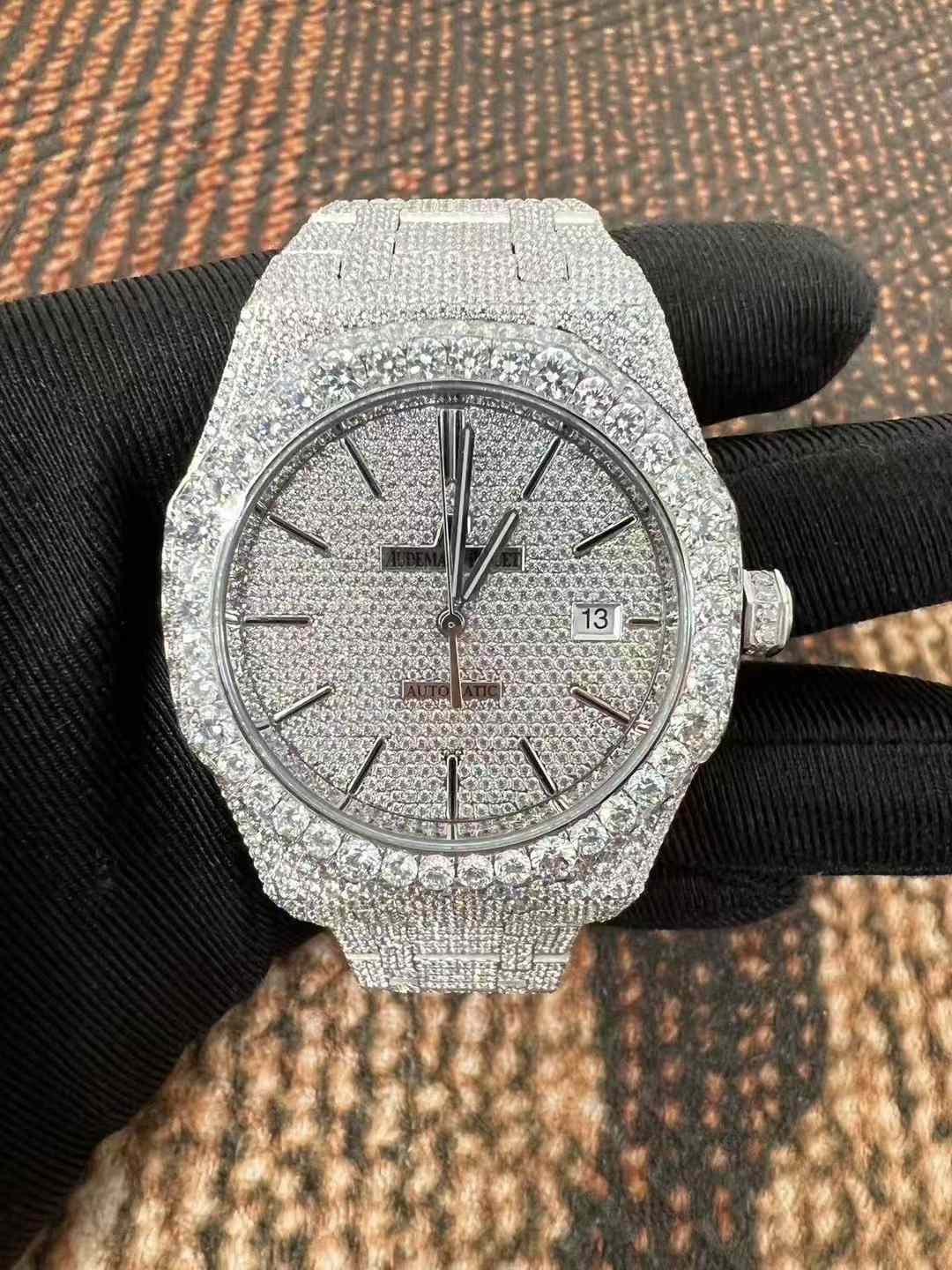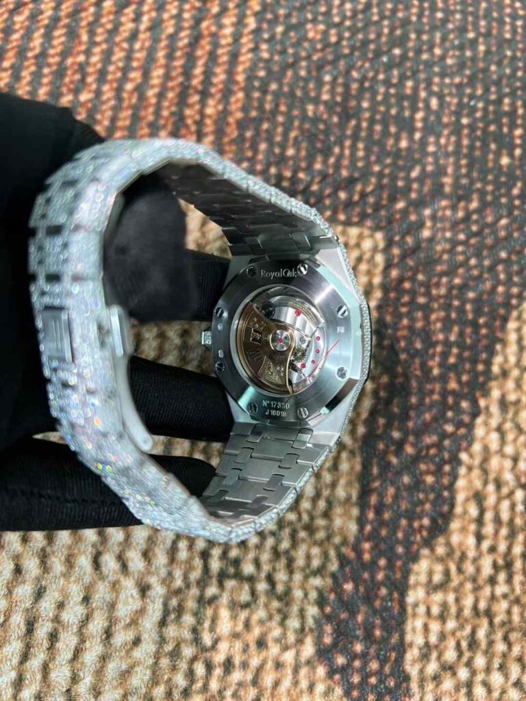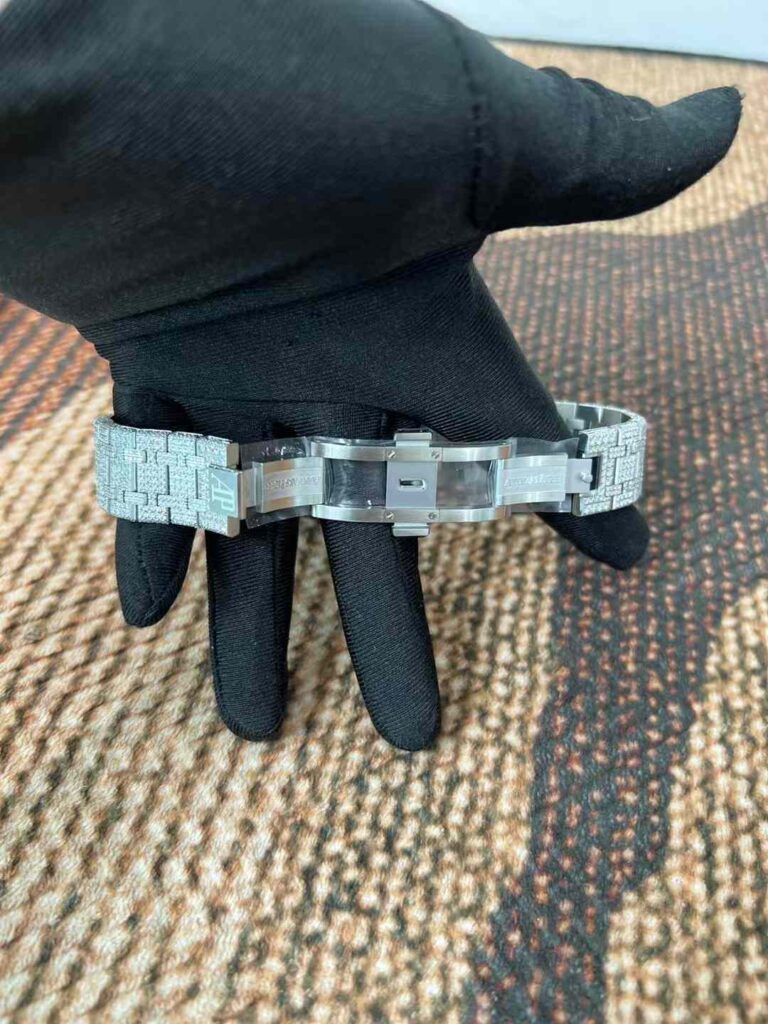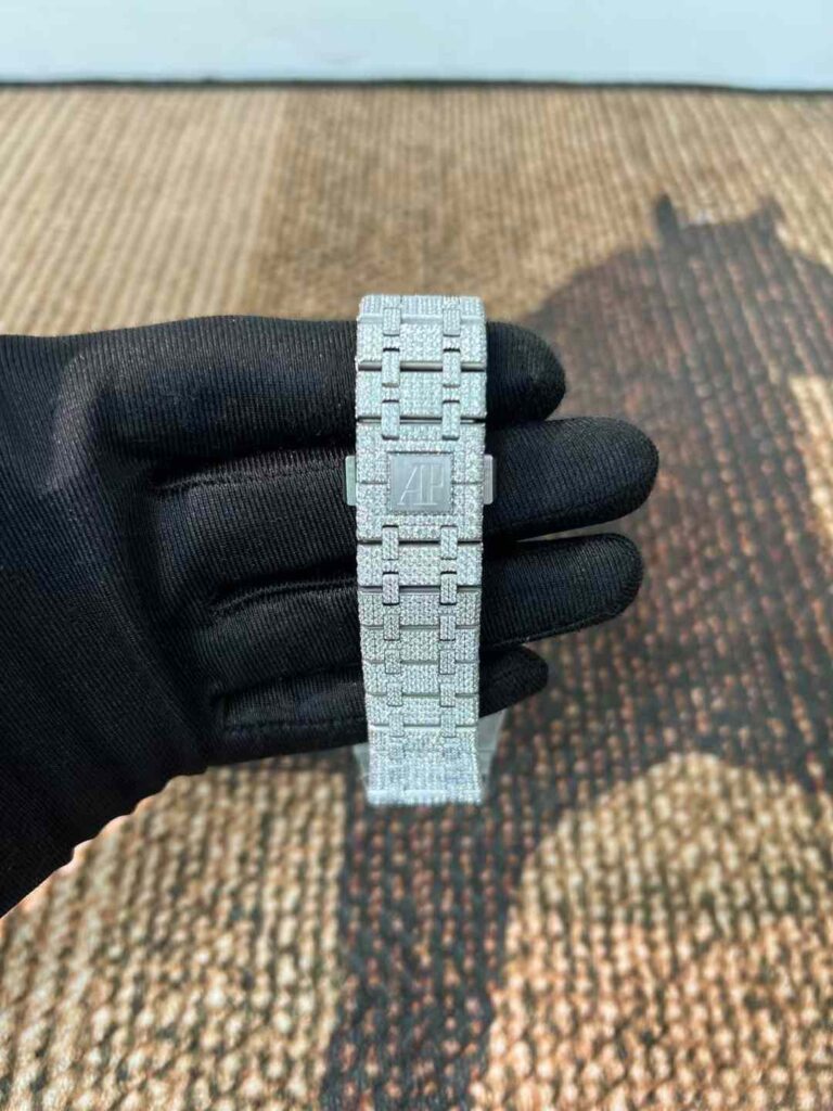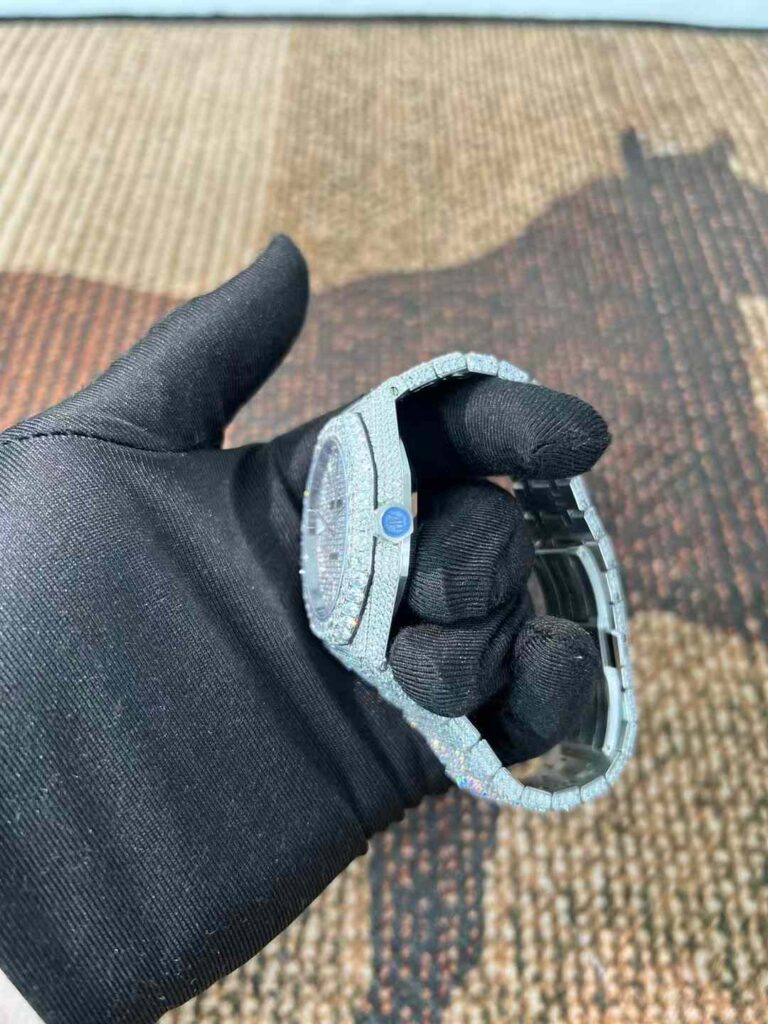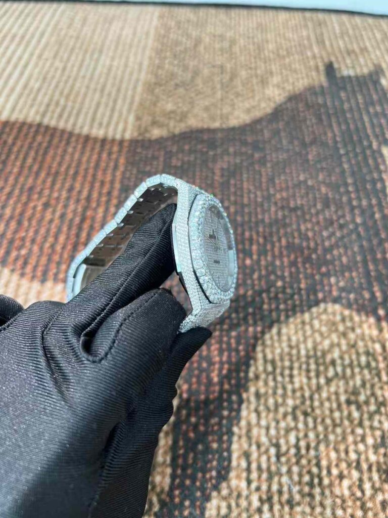 - 一部の業者や個人カスタマイザーが、市場に出回っているAPウォッチを購入後、ケースやブレスレット、ベゼル部分にモアッサナイトをはめ込み、いわゆる「アイスドアウト(iced out)」と呼ばれるきらびやかな改造を行います。
