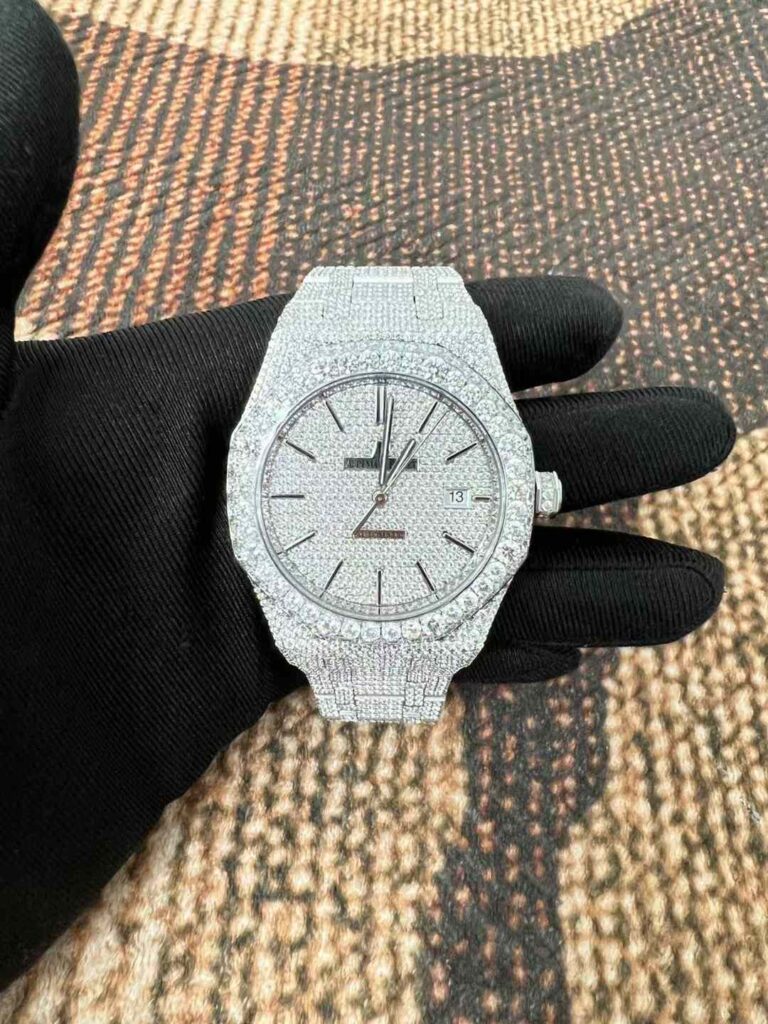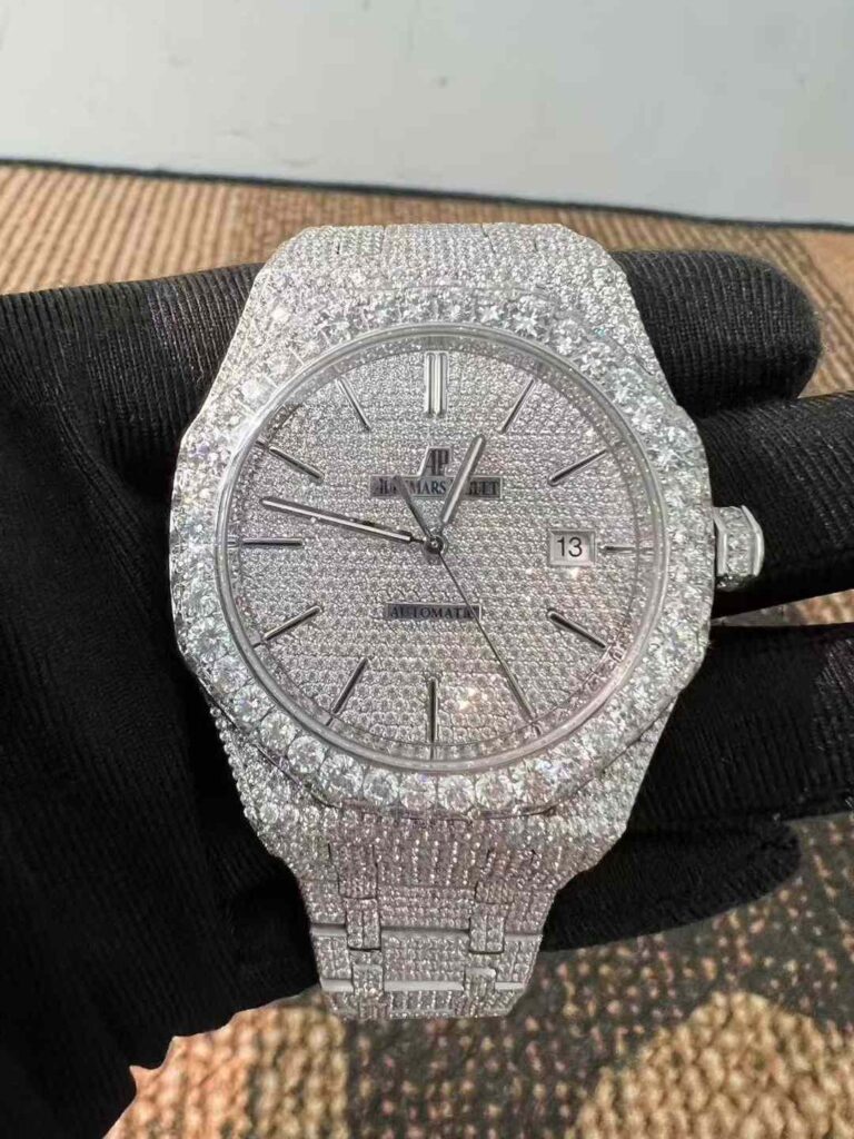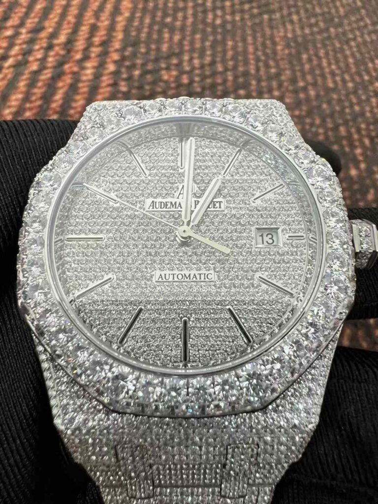 「AP(オーデマ・ピゲ)」の名で知られる高級時計ブランドのモデルを、モアッサナイトで装飾したカスタムウォッチに関する詳細情報です。なお、純正のオーデマ・ピゲ(Audemars Piguet)社製時計は通常、本物のダイヤモンドを使用しており、メーカー純正品として“モアッサナイト”を使用することはほとんどありません。したがって、「AP モアッサナイト ダイヤモンド ウォッチ」と呼ばれる場合、多くはサードパーティによるアフターマーケットでのカスタム(改造)が施された時計であることが多い点に留意してください。