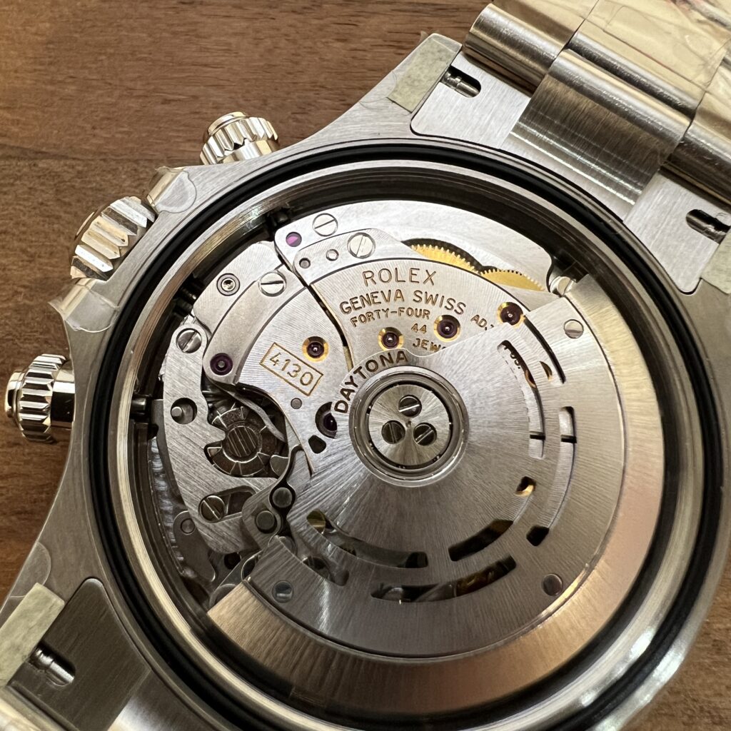 Rolex Daytonaに搭載されているCalibre 4130は、ロレックスが自社で設計から製造まで行う自動巻きクロノグラフムーブメントです。コラムホイール&垂直クラッチ方式による高い操作性、部品点数削減によるメンテナンス性の向上、約72時間という長いパワーリザーブなど、機能性と実用性を兼ね備えた名機として知られています。