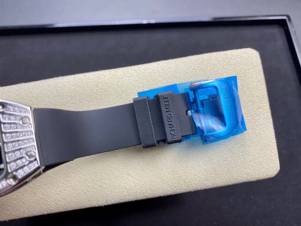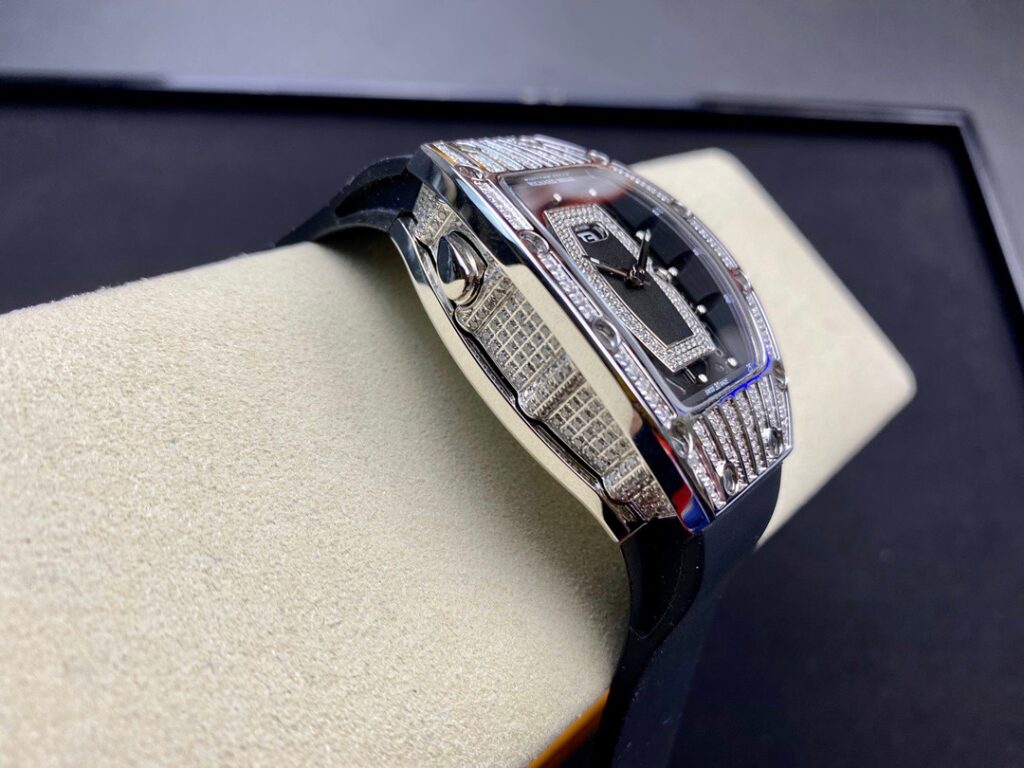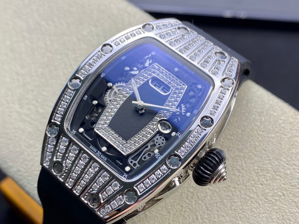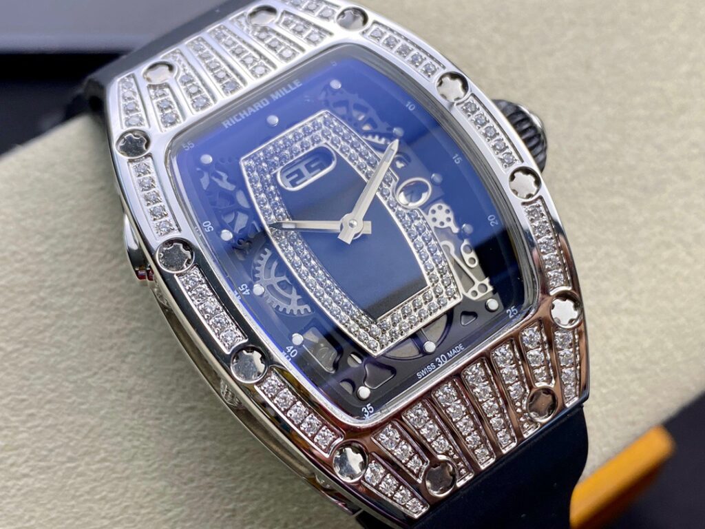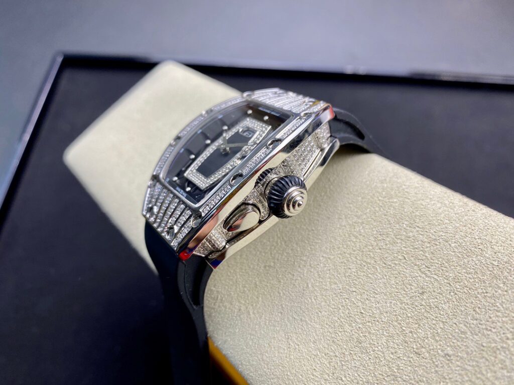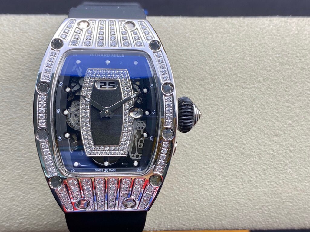 RM 07-01がその卓越した機械的な完璧さで輝いているのなら、コレクションの中で最も小さいトノー型ケースデザインのセンシュアルな曲線と、中央にジェムストーンをセットしたダイヤルも煌めきを放っているといえます。