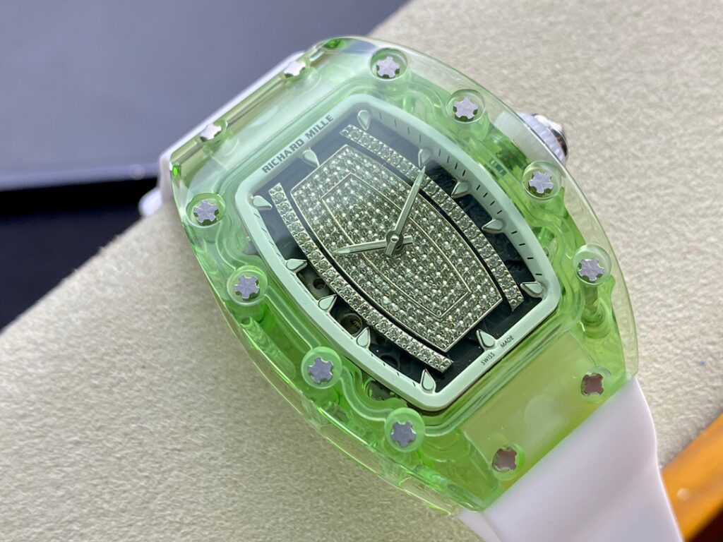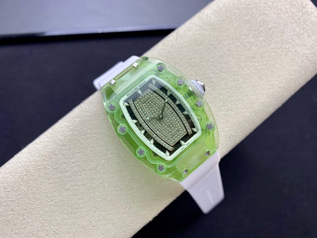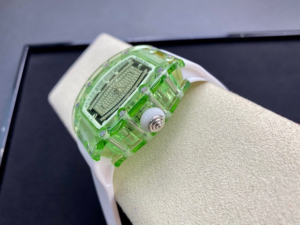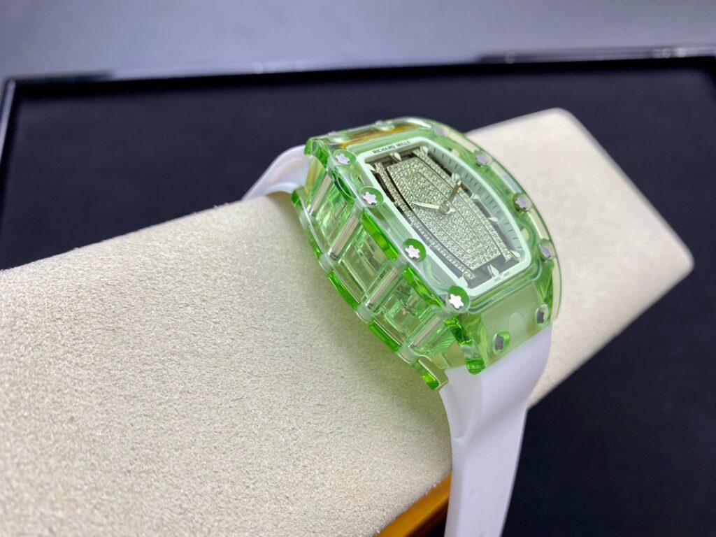 RM 07-01がその卓越した機械的な完璧さで輝いているのなら、コレクションの中で最も小さいトノー型ケースデザインのセンシュアルな曲線と、中央にジェムストーンをセットしたダイヤルも煌めきを放っているといえます。