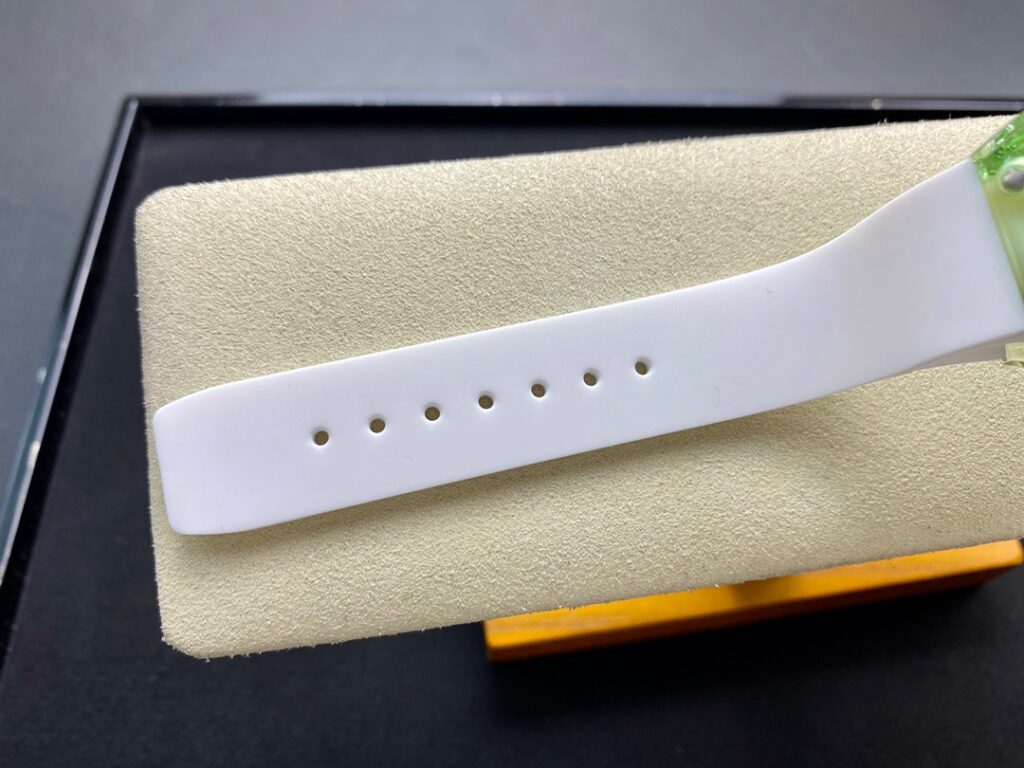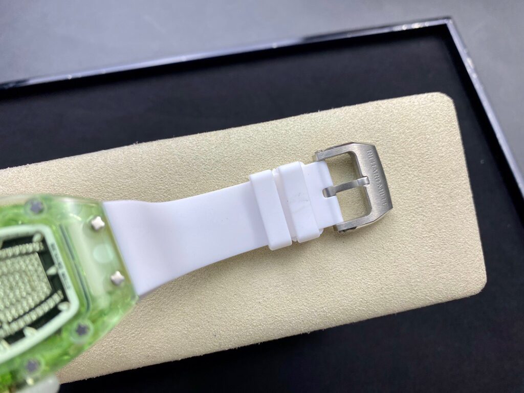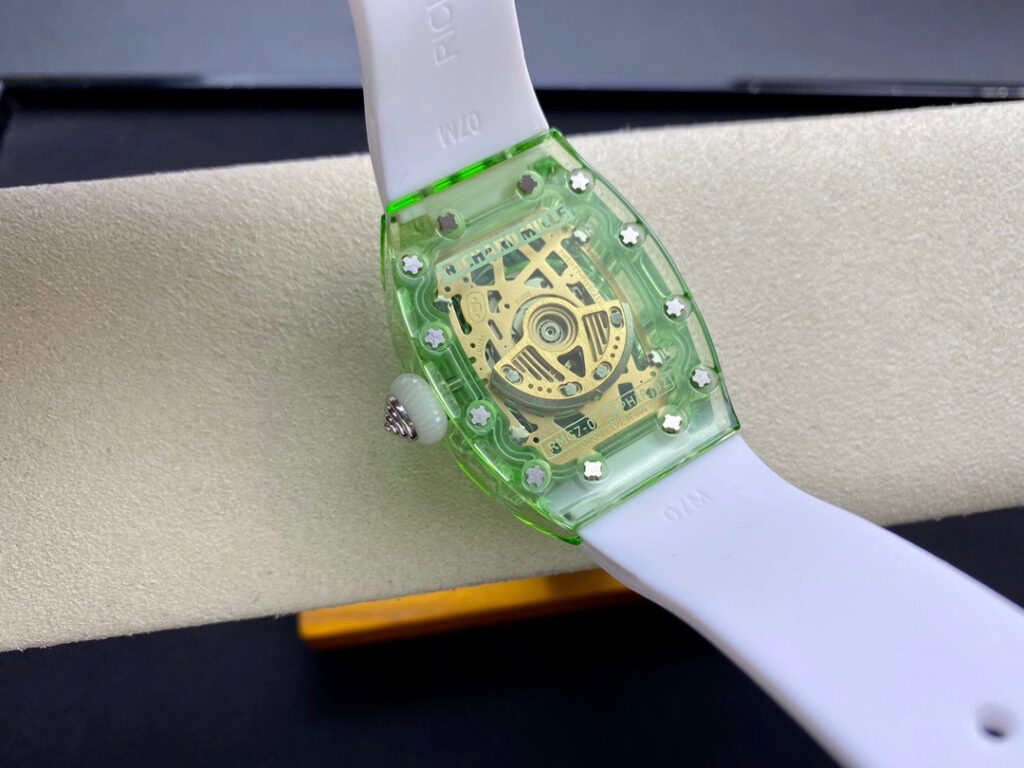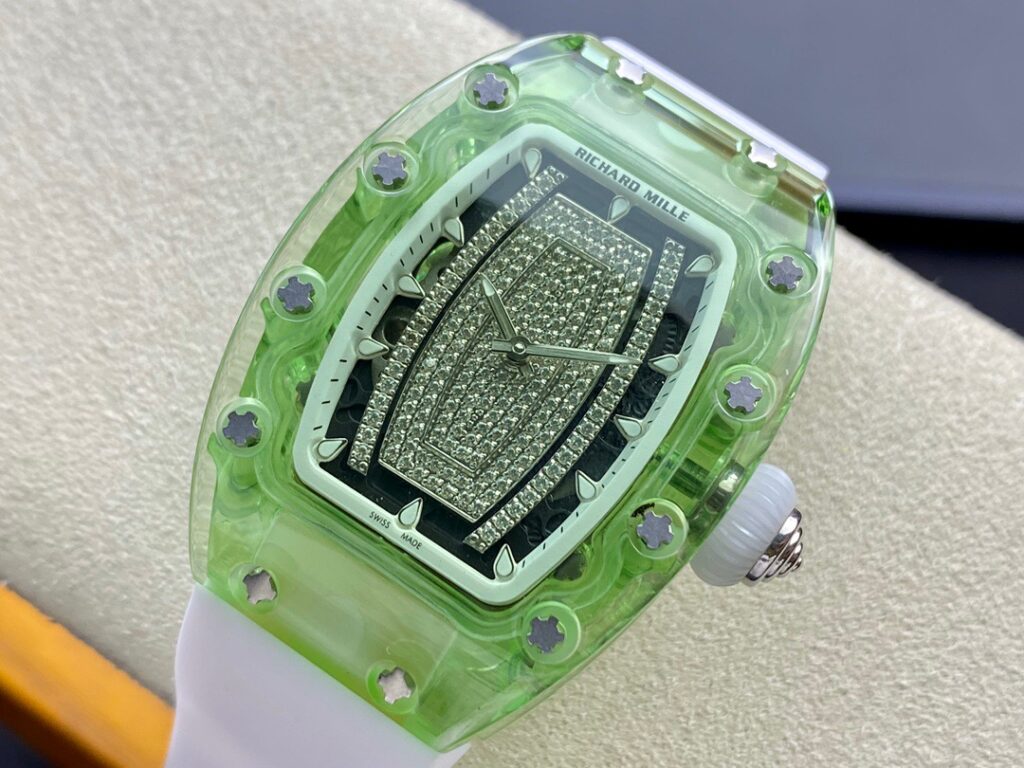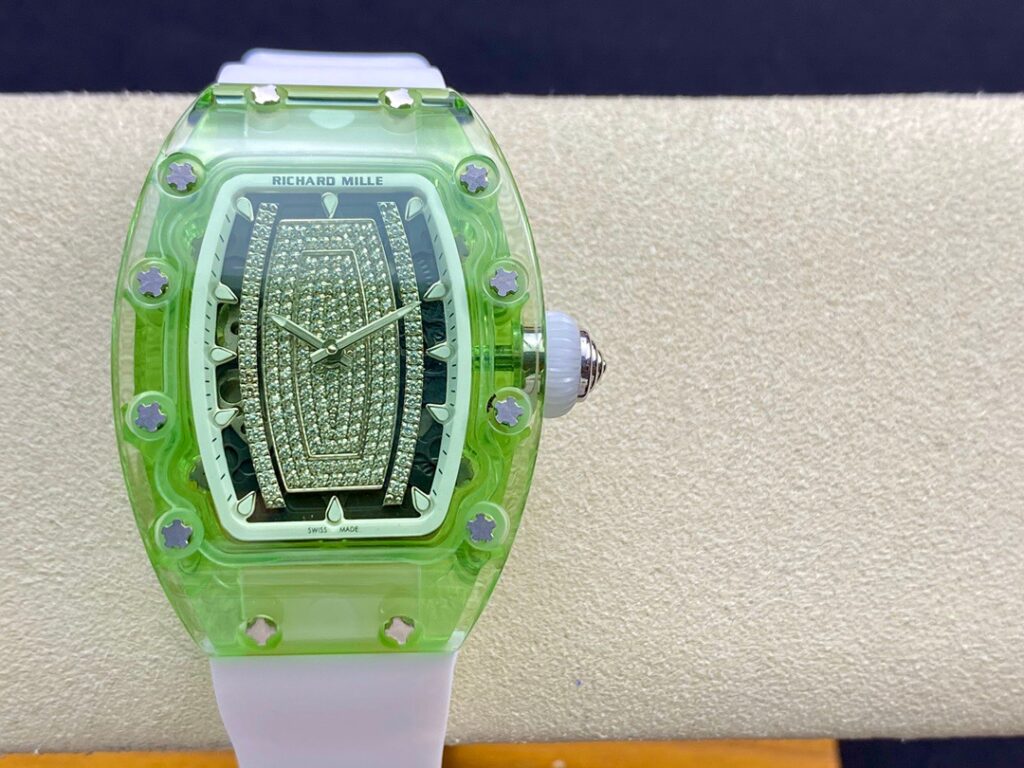 RM 07-01がその卓越した機械的な完璧さで輝いているのなら、コレクションの中で最も小さいトノー型ケースデザインのセンシュアルな曲線と、中央にジェムストーンをセットしたダイヤルも煌めきを放っているといえます。